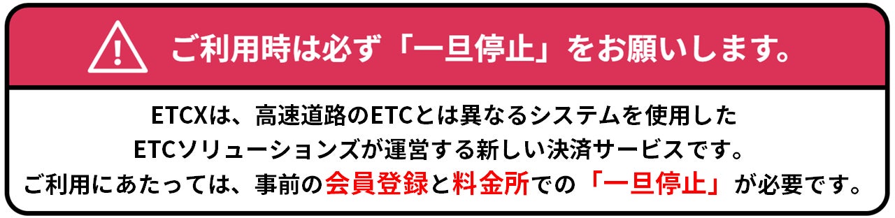 ETCカードとクレジットカードを用いて、予め『ETCX』に会員登録を行ったのち、会員登録したETCカードを車載器に挿入することで、高速道路以外の有料道路、ガソリンスタンドなど、『ETCX』ロゴマークが掲示してある施設・店舗で車に乗ったまま、利用料金や買い物代金をお支払いすることができます。