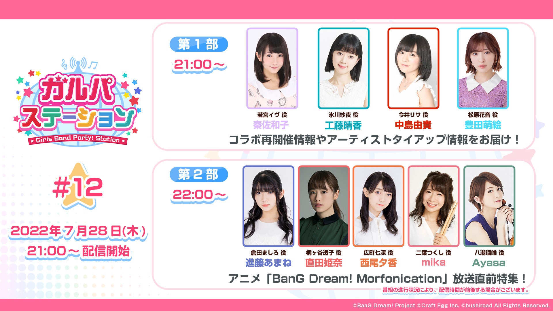 株式会社Craft Egg(本社:東京都渋谷区 代表取締役:森川 修一、以下、Craft Egg)と、株式会社ブシロード(本社:東京都中野区 代表取締役社長:木谷 高明、以下、ブシロード)の共同制作によるスマートフォン向けゲーム「バンドリ! ガールズバンドパーティ!」(以下、ガルパ)は、7月28日(木)21時より配信の「ガルパステーション #12」にて、コラボの再開催情報を発表いたします。また、「佐藤純一(fhána)」や「TK (凛として時雨)」とのアーティストタイアップの続報や、アニメ「BanG Dream! Morfonication」の放送直前特集もお届けいたします。さらに生放送終了後の23時より、同配信ページにてアニメ「BanG Dream! Morfonication」の#1を放送いたします。ぜひご覧ください。