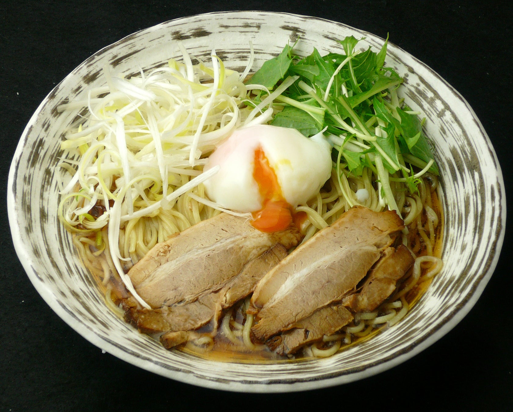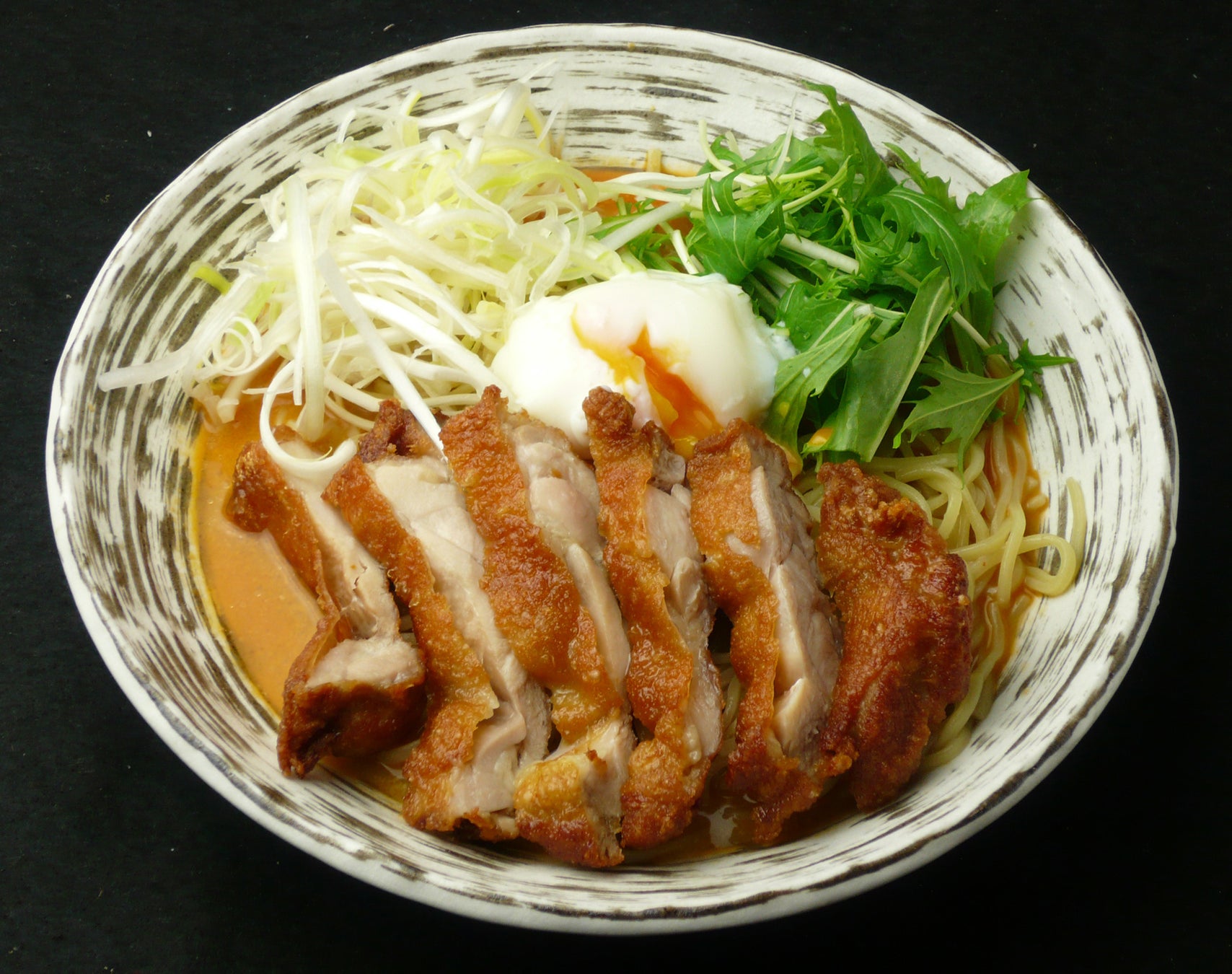 パリパリの揚げ鶏をピリ辛ゴマスープでお召し上がりいただく【冷製芝麻麺】、さっぱり醤油スープの【冷やし醤油ラーメン】、温泉玉子を崩してスープや麺と絡めてお召し上がりください。