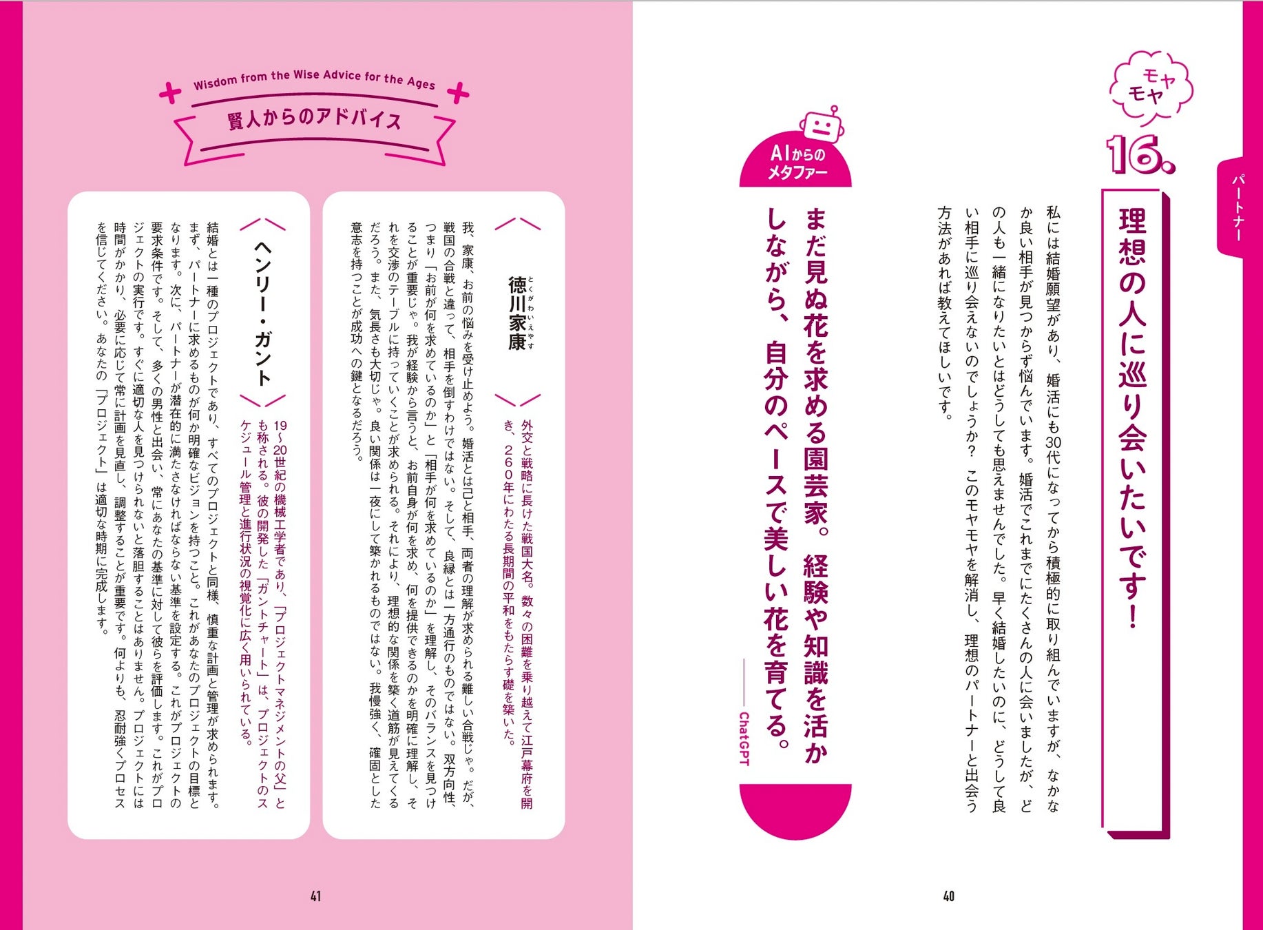 女性の30代は仕事や結婚や育児と、人生において悩みが一番多い時期。本書は、そのさまざまな女性たちの「モヤモヤ」とした感情84個を、AIと共に解消していく自己啓発書です。ChatGPTが学習した膨大な情報の中から、①新しい気づきをもたらすメタファー(隠喩)と、②世界の賢人の言葉を紡いだアドバイス、この2