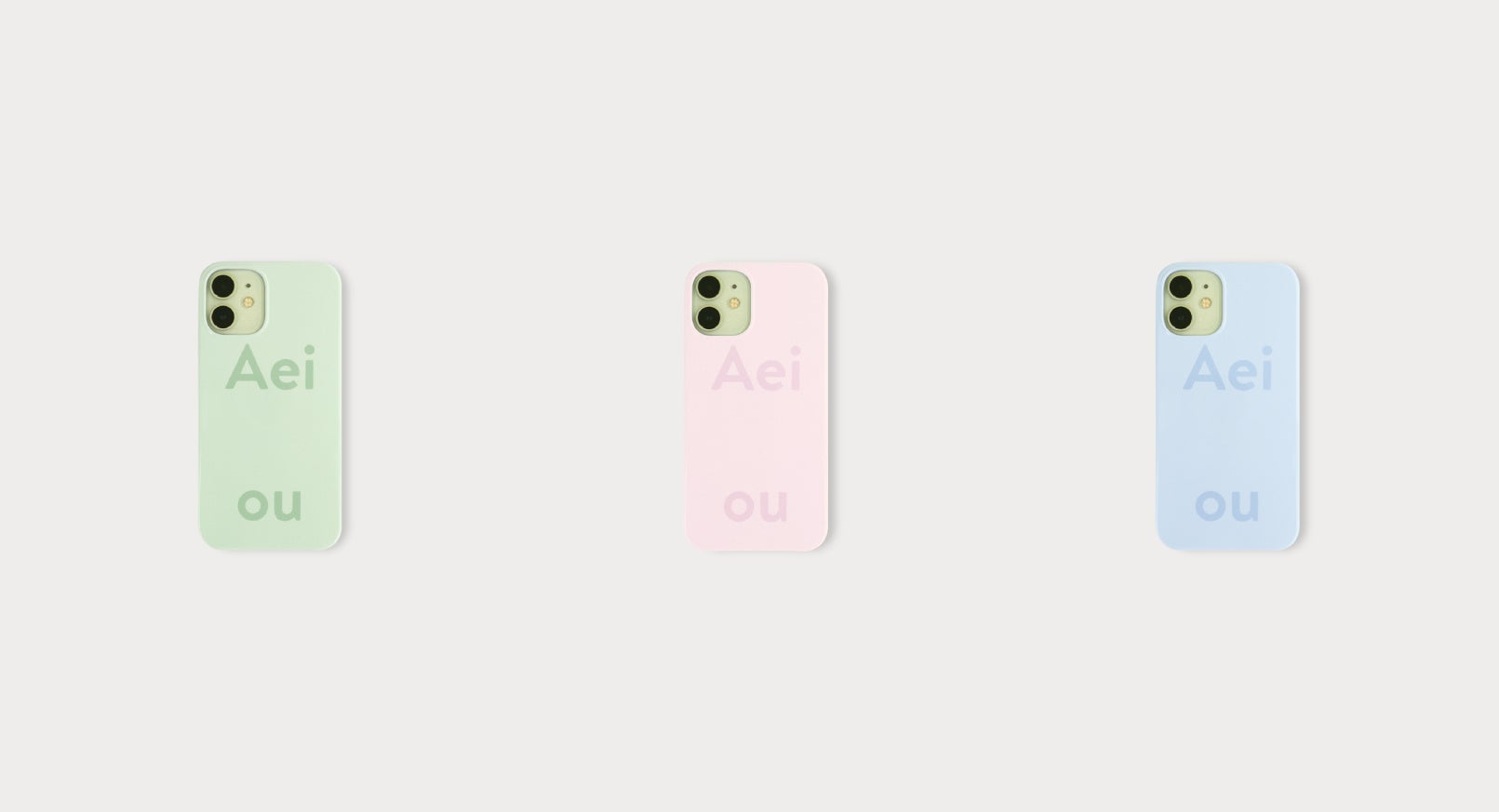 今回の新デザインのタイトルは「Glossy」。その名前通り艶あり加工のハードケースに、パステルカラーでAeiouのロゴをあしらいました。トーンオントーン配色がやわらかくて可愛らしい、春にぴったりのスマホケースです。