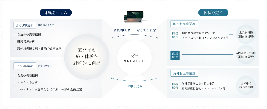 当社は、「100年先の未来へ、日本中の多様な文化が継承される『仕組み』を創る」という企業理念のもと、持続可能な観光による地方創生を実現する"社会インフラ"を実装するため、2017年1月の設立以来、訪日富裕層旅行市場No.1プレイヤーを目指してまいりました。BtoB型承認制プラットフォーム「XPERISUS.com」のリリースを皮切りに海外富裕層向け事業を開始しましたが、COVID-19パンデミックの影響により一時的に海外販売事業を停止。しかし、この期間を事業基盤強化の好機と捉え、国内富裕層向け事業、法人向け事業(BtoB)、官庁自治体向け事業(BtoG)へと事業領域を戦略的に拡大いたしました。
