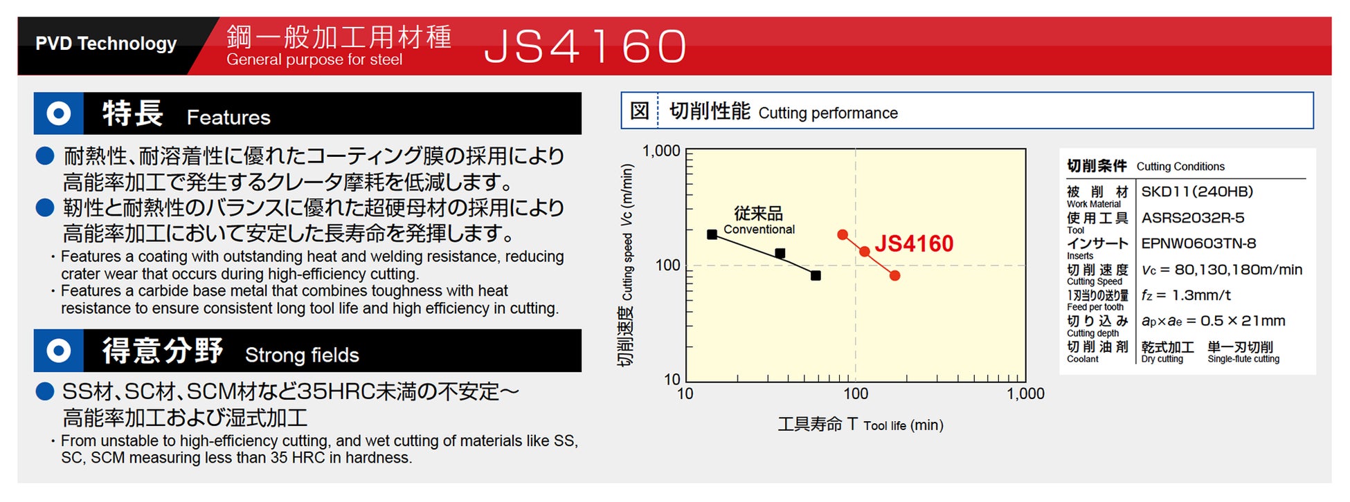 SS材、SC材、SCM材など35HRC未満の被削材の不安定加工や高能率加工に適しており、湿式加工にも対応します。