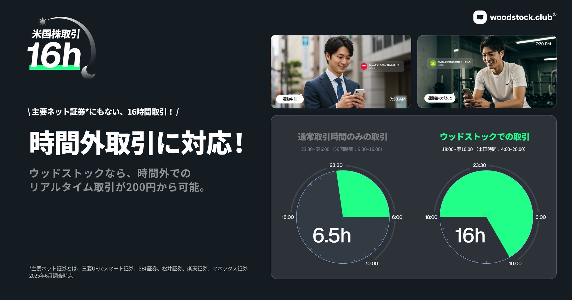 また本日2025年6月17日より、米国株式の時間外取引サービス(プレマーケットおよびアフターマーケット)の提供を開始いたします。これにより、お客様は従来の米国市場の正規取引時間(米東部時間9:30~16:00、日本時間22:30~翌5:00頃 *夏時間の場合)に加え、プレマーケット(日本時間17:00~22:30)およびアフターマーケット(日本時間5:00~9:00 *夏時間の場合)の時間帯にも、対象銘柄の売買が可能となります。主要ネット証券でもまだあまり例のない、時間外でのリアルタイム取引を200円から可能にすることで、これまで日本時間の深夜でしか行えなかった、米国株の取引がより簡便に、日中でも取引しやすくなります。これからも、より手軽でより良い資産形成のために、ユーザーの目線に寄り添ったソーシャル投資プラットフォームとしてサービスの向上に引き続き努めてまります。