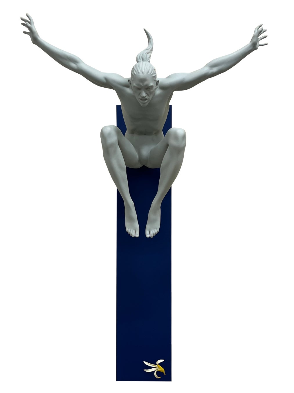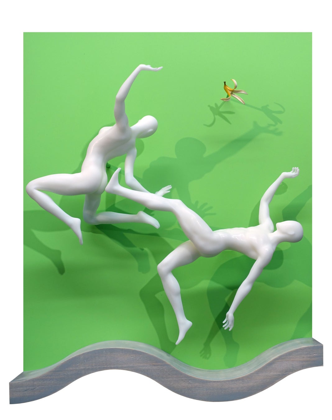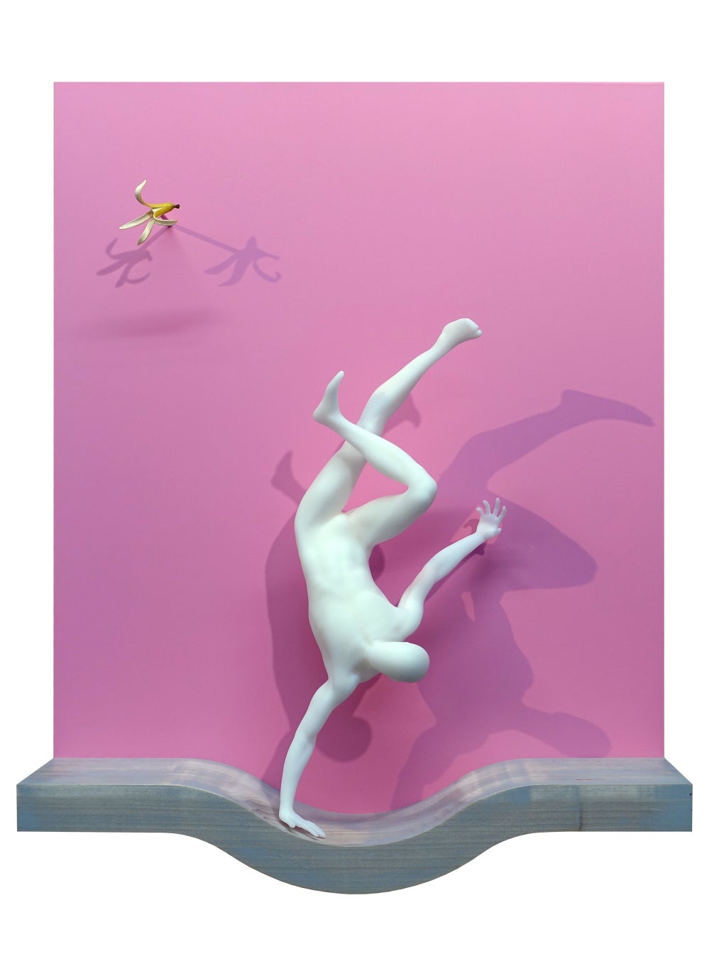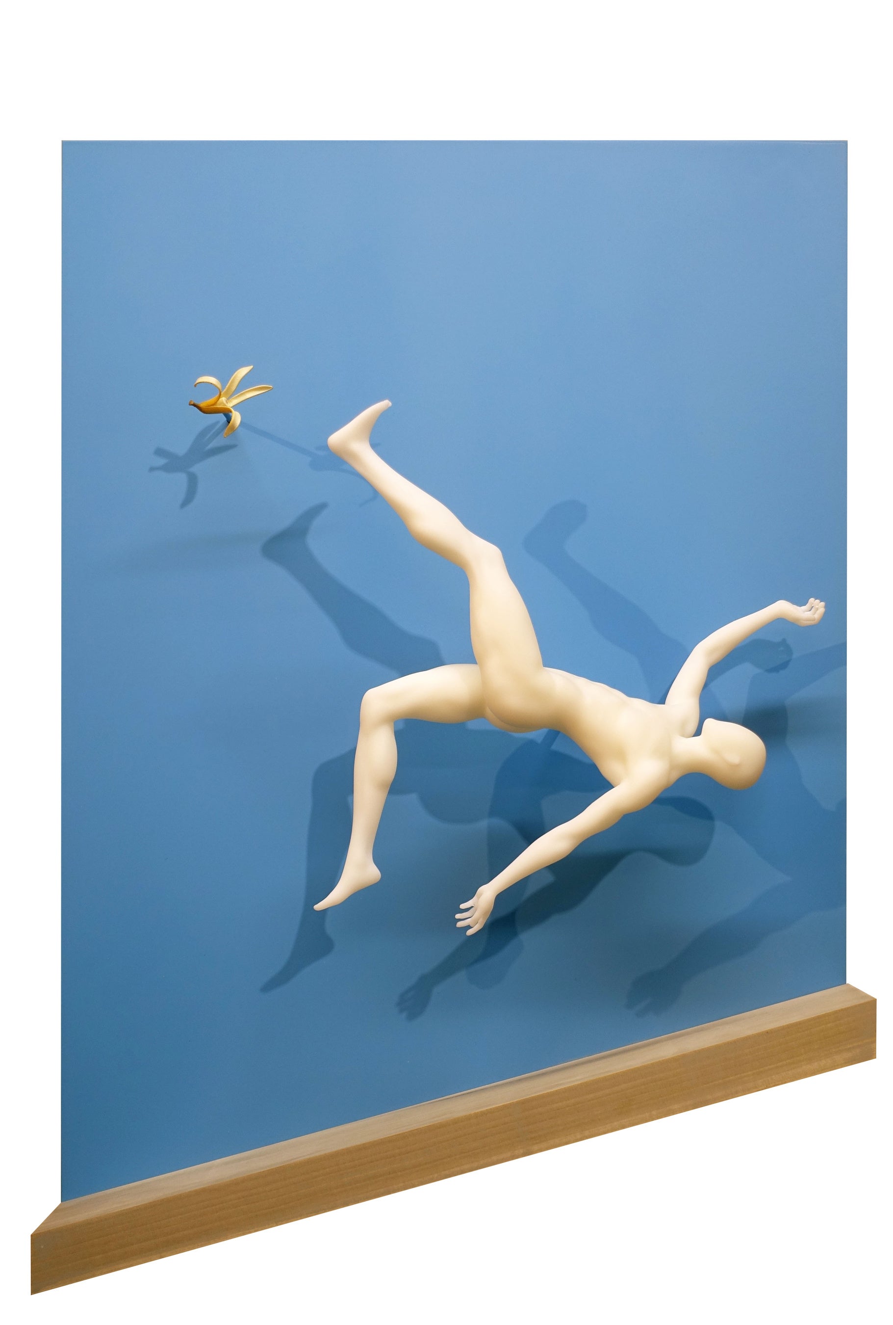 このシリーズは、バナナで転ぶという見たことがありそうで、実際に見たことないものを、緻密な人体造形で制作したシュールなユーモアを表現した作品です。この作品は、マネキン制作を手掛けるトーマネの高い技術力によって表現できるアート作品であると考えております。