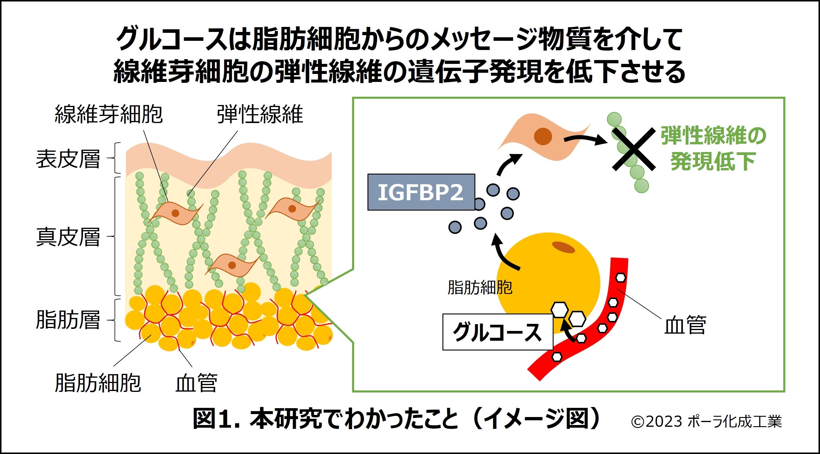 血中グルコース濃度の上昇は、脂肪細胞に働きかけて身体にさまざまな悪影響を及ぼすことが知られていますが、皮膚への影響はよくわかっていません。しかし、脂肪細胞は皮膚深部に存在し皮膚と相互作用していることから、グルコースが脂肪細胞を介して皮膚に影響を及ぼすのではないかと考え、検証を行いました。