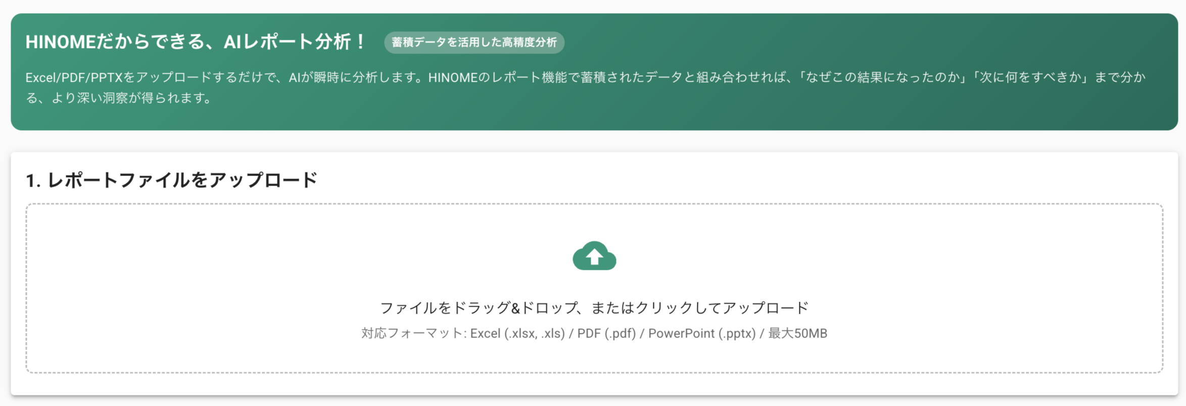 資料のアップロード お手持ちの既存の分析資料(Excel、PowerPoint、PDF形式)をHINOMEの管理画面にアップロードします。AIによる高速分析 アップロードされた資料を、HINOME AIが独自のデータベースと照合しながら約1分で高速に解析します。
