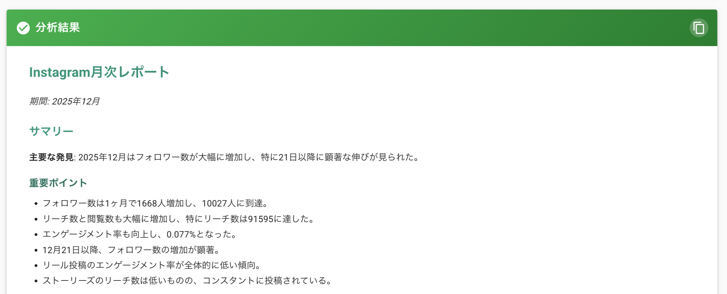 次回行うべきアクションの具体的提示: 「来週はエンゲージメント率の高いリール投稿を2本、インサイトに基づいたこのテーマで投稿しましょう」といった、担当者が即座に実行できるレベルまで具体化したアクションプランを提示します。