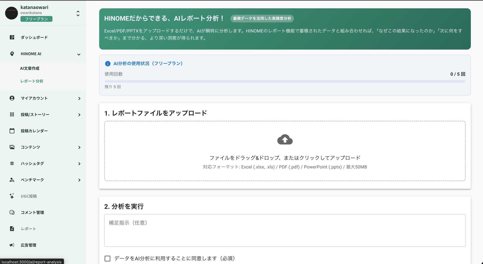 本機能は、ユーザーが普段作成している分析レポート(Excel、PowerPoint、PDF形式)をアップロードするだけで、HINOME AIが約1分という短時間で内容を解析。データ分析結果の解説から、アカウントの傾向値の抽出、そして次に繋がる具体的なアクションプランの提示までを自動で行います。