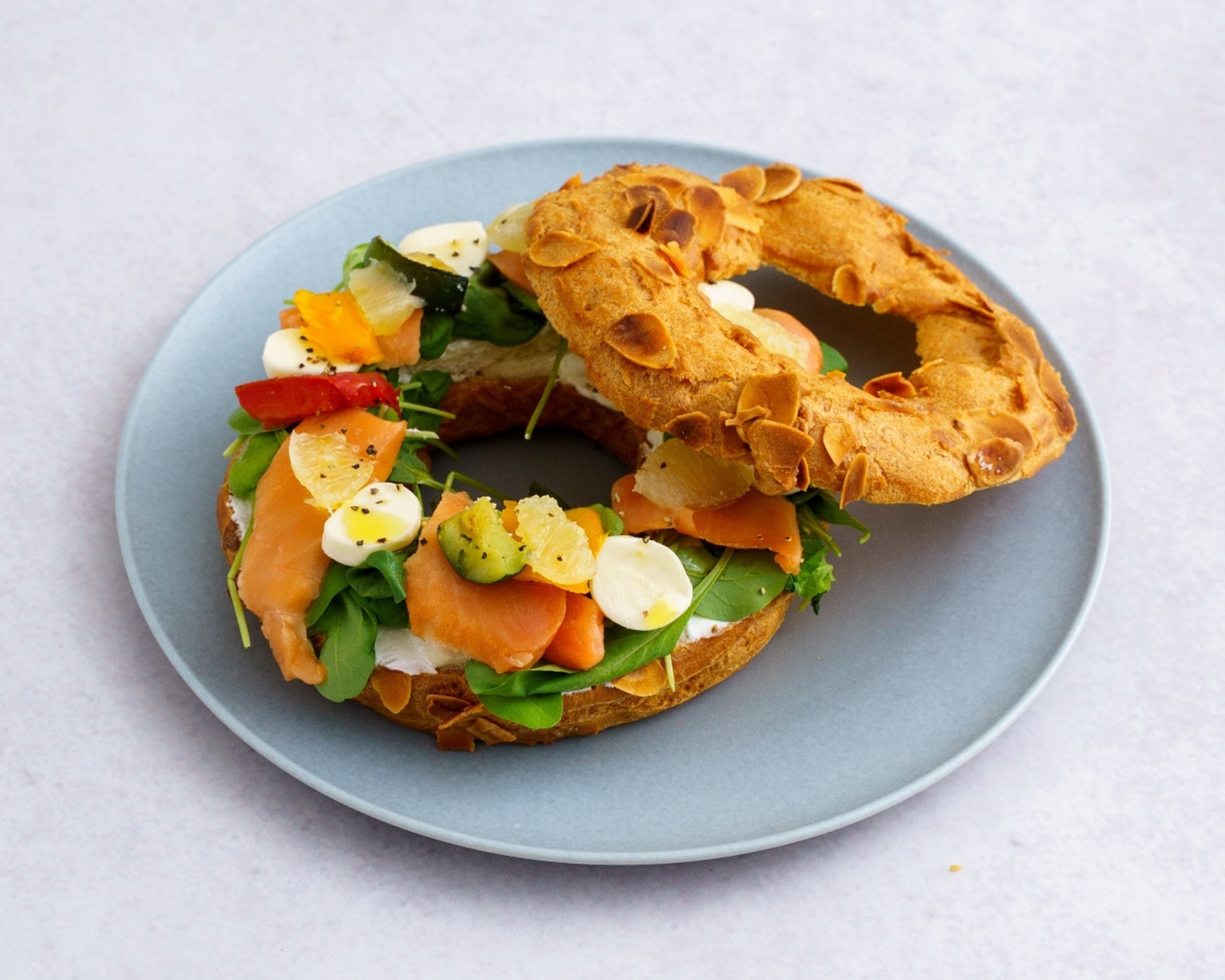 スモークサーモンに彩り野菜とモッツァレラチーズを合わせたエクレール サレ。レモンの爽やかな酸味がアクセントとなり、軽やかでバランスのとれた味わいです。