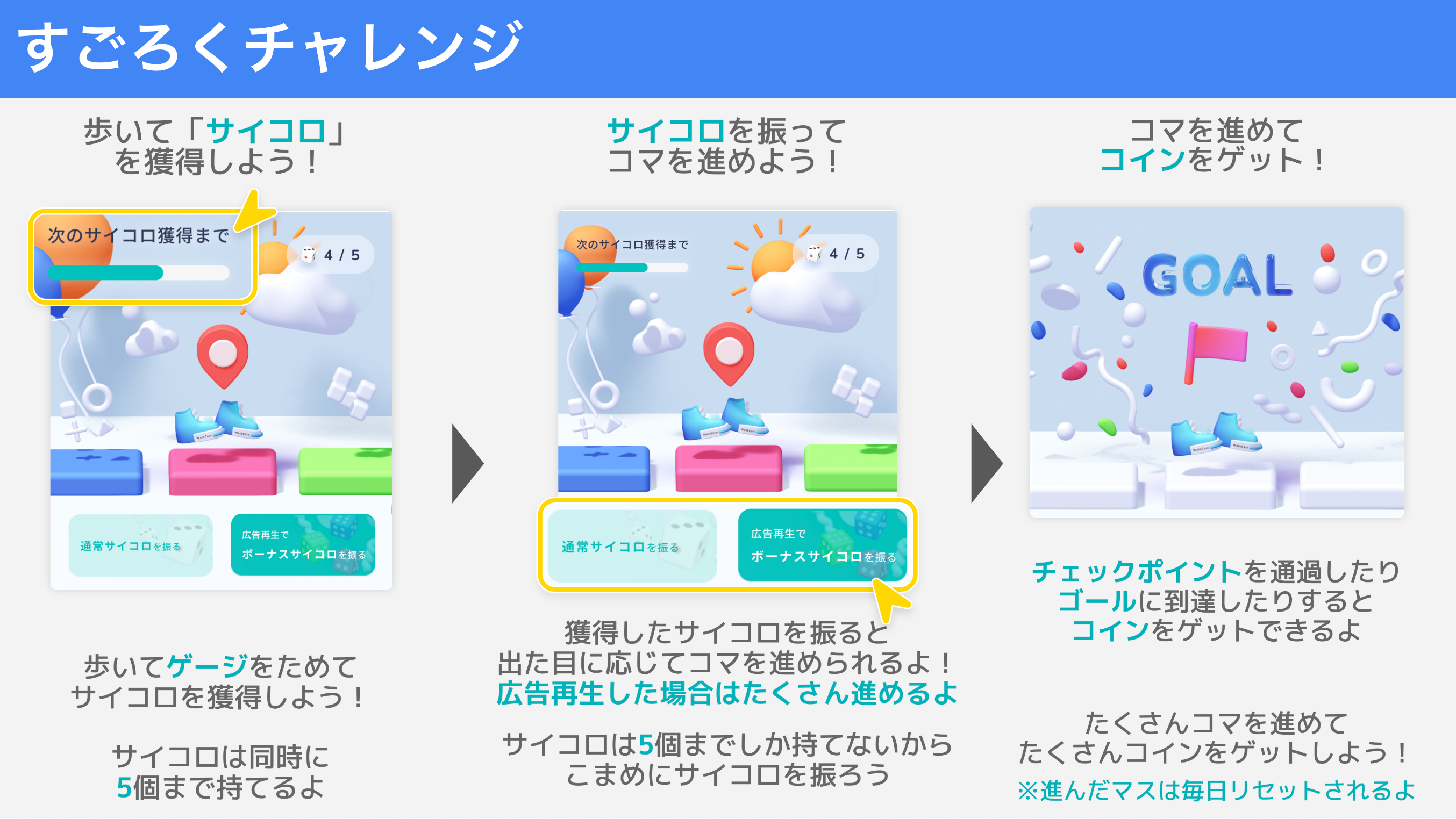 約500歩歩いてゲージがたまると、サイコロを1個獲得できます。獲得したサイコロを振ることでコマを進めて、チェックポイントを通過したり、ゴールに到達したりするとコインを獲得することができます。動画広告を再生するボーナスサイコロを振ると出る目が大きくなり、コマを早く進めることができます。なお、サイコロは5個まで同時に持つことができます。
