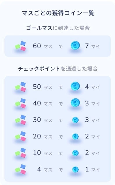 ・チェックポイントを通過したり、ゴールに到達したりすると、マスに応じてコインを獲得することができます。