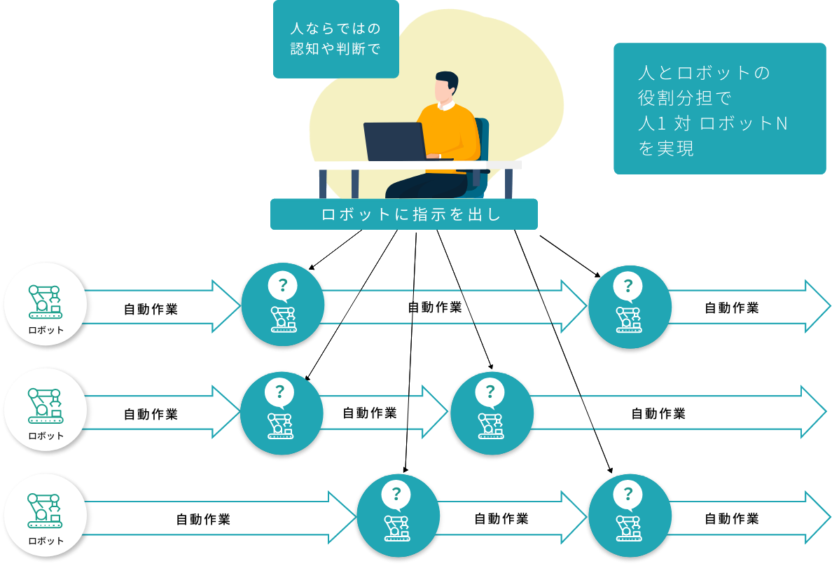 リモートロボットシステムの導入によってロボットの自律動作に加えて人ならではの認識や判断を活かすことが可能になり、リモートだからこそ、人:ロボット=1:多を実現できます。