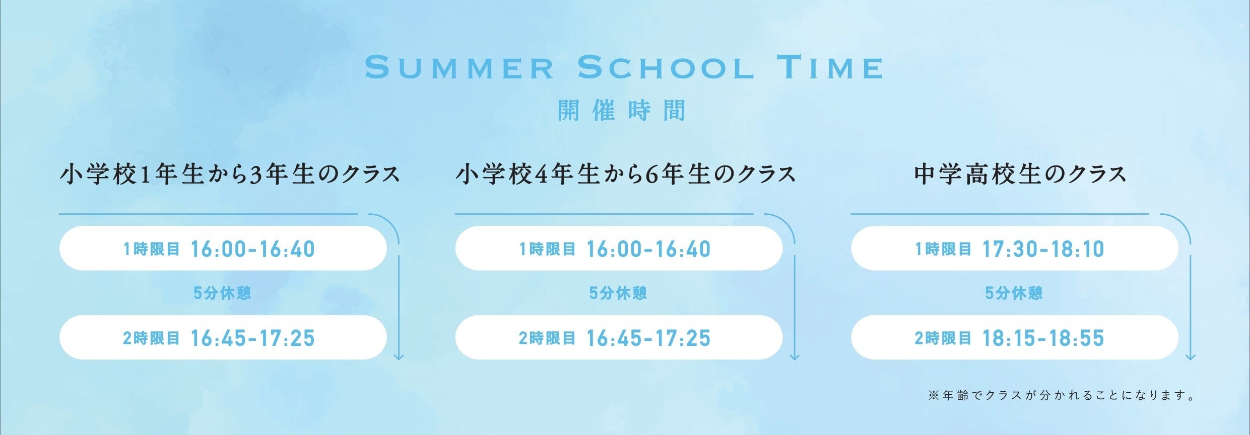 【開催時間】は小学生の2クラスは16:00~17:25、中高生のクラスは17:30~18:55になります。