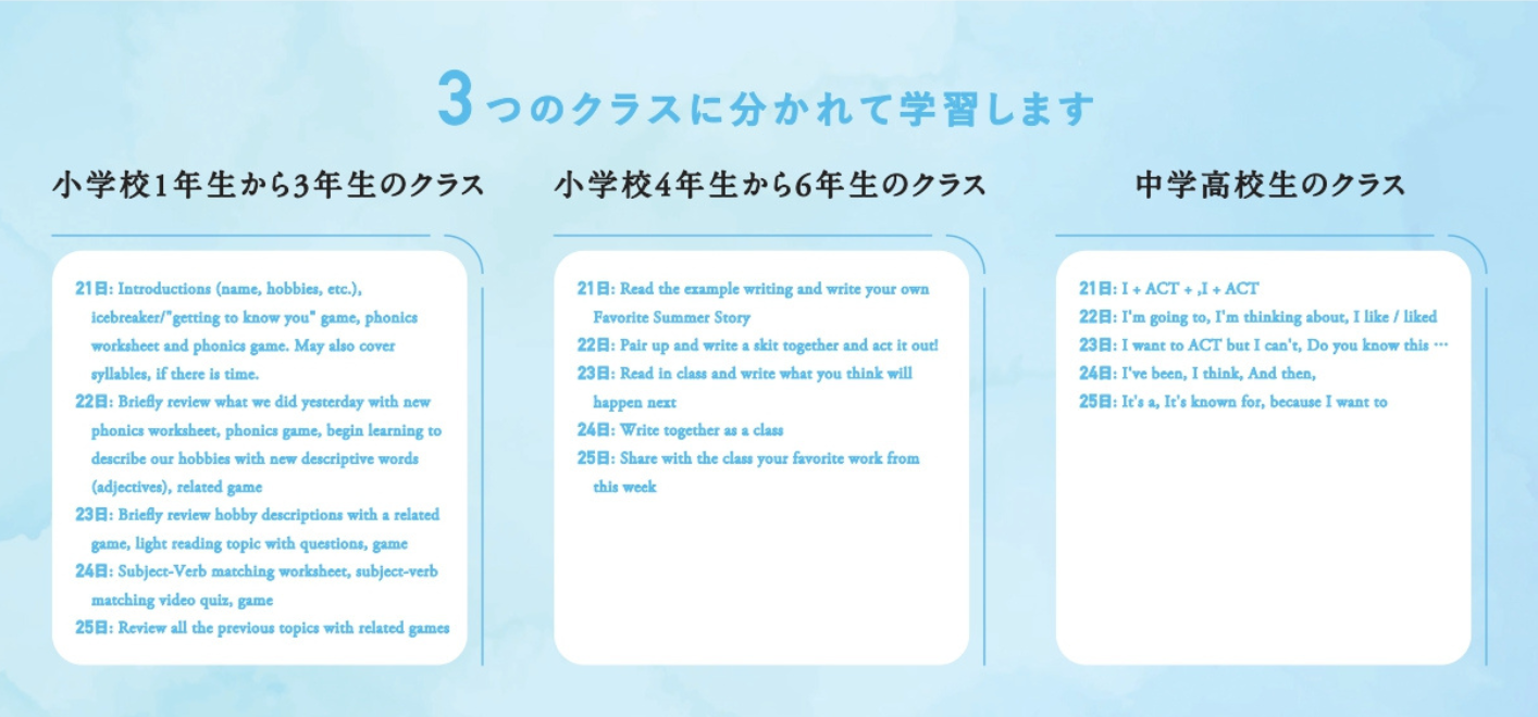 8月21日から25日の5日間に開催されるサマースクールでは、ESL教育を日本にいながら体験できる機会を提供します。ESL教育は英語を十分に理解し話す・読む・書く・聞くスキルを向上させることを目的としています。