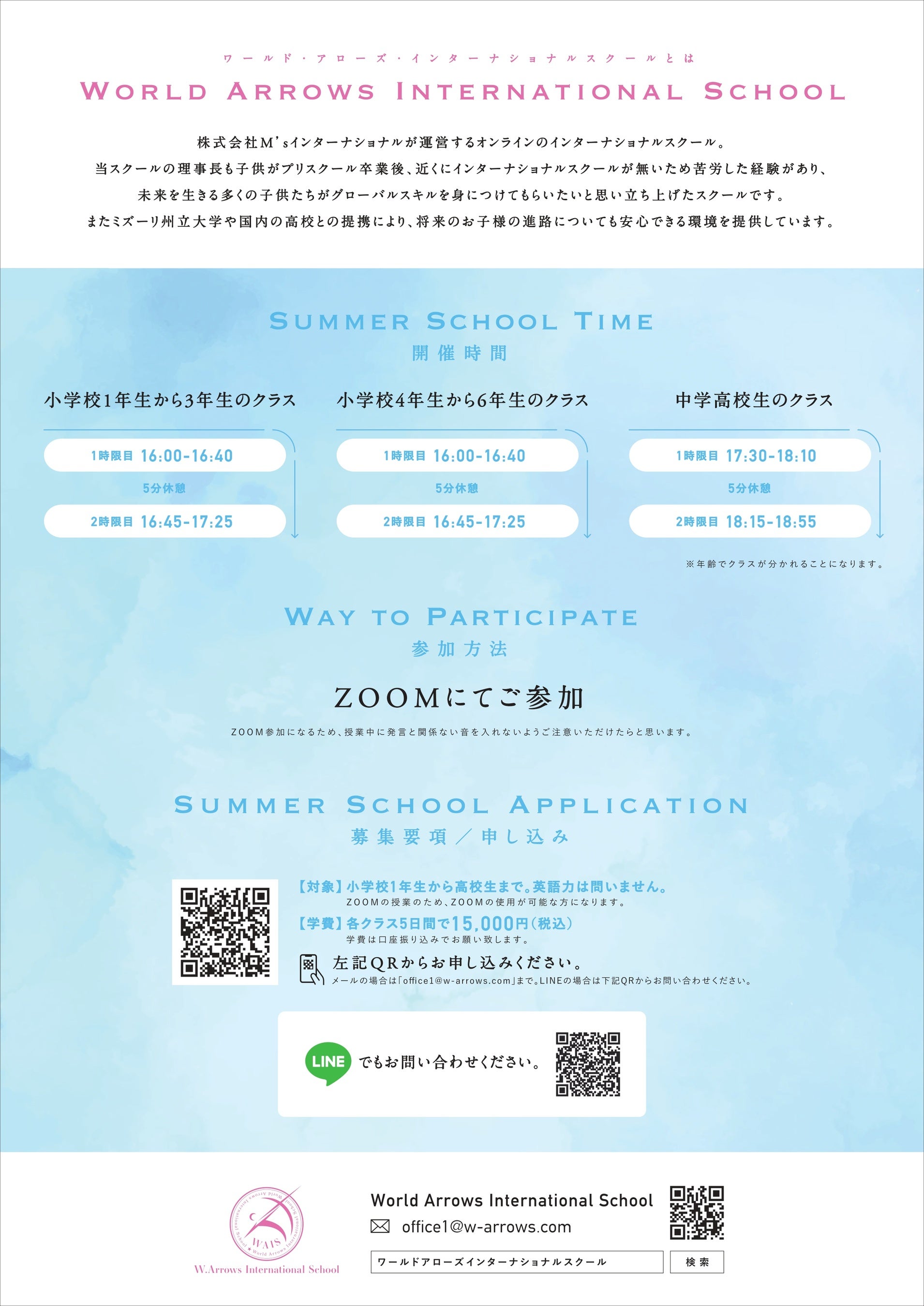 【株式会社Mʼsインターナショナルについて】 2007年5⽉に東京都新宿区に設⽴。「時代の変化にあわせて社会 に必要なものをつくる」ことをモットーにAI研究開発事業、IoT事業、Blo ckchain関連事業、教育事業等と幅広く事業を展開する。 2022年2⽉、アメリカの⾼校卒業証明書を取得できるインターナショナ ルスクール「World Arrows International School(ワールド・アローズ・ インターナショナルスクール)を設⽴。