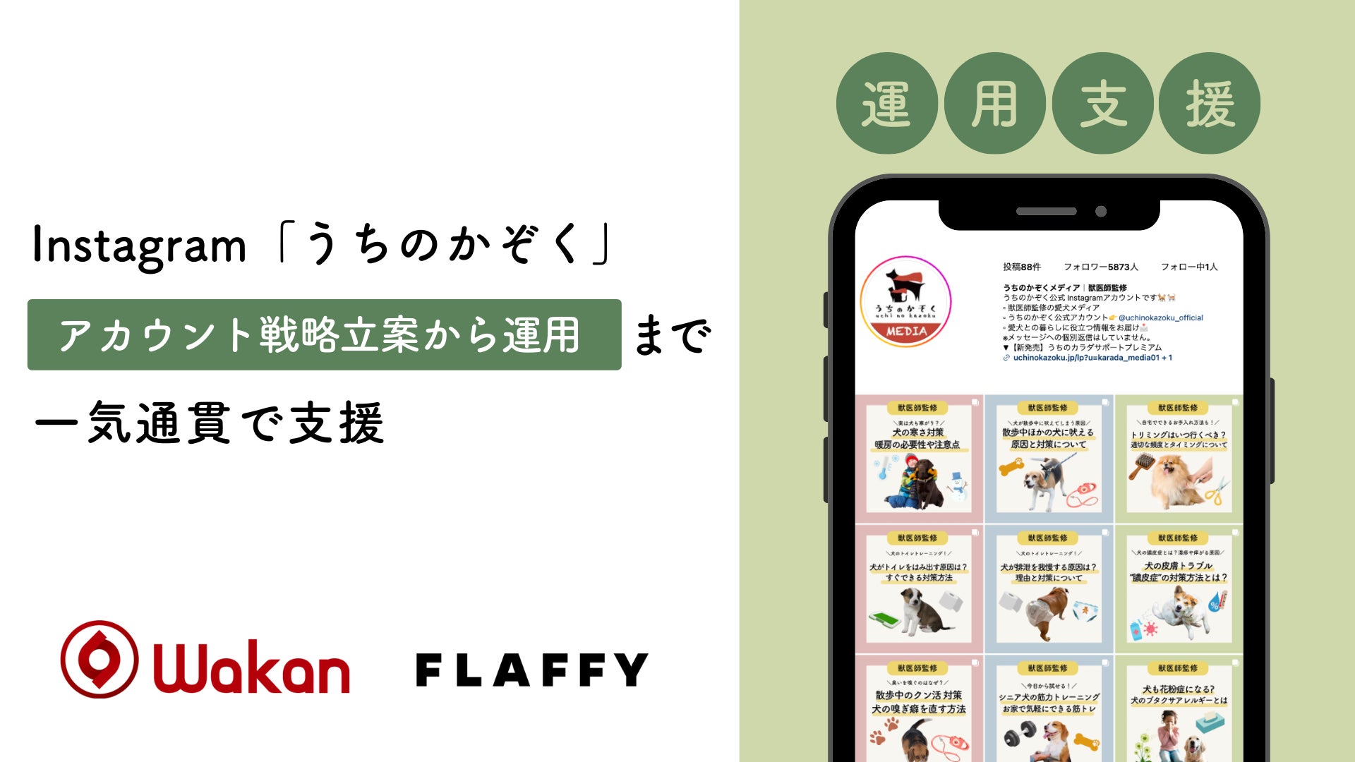 “イヌとヒトの関係をフラットに”をコンセプトに、13.8万フォロワーの国内最大級の犬情報メディア事業や人間の服を愛犬の服にリメイクするサービスを展開する株式会社FLAFFY(本社:東京都渋谷区、代表取締役:廣田 智沙/以下 当社)は、株式会社和漢(本社:福岡県福岡市、代表取締役:上田健太郎/以下 和漢)の動物愛玩用品ブランド「『うちのかぞく』のInstagramを立ち上げから運用まで一気通貫で支援し、6ヶ月で3,800フォロワーを達成したことをお知らせします。(https://www.instagram.com/uchinokazoku_media/)