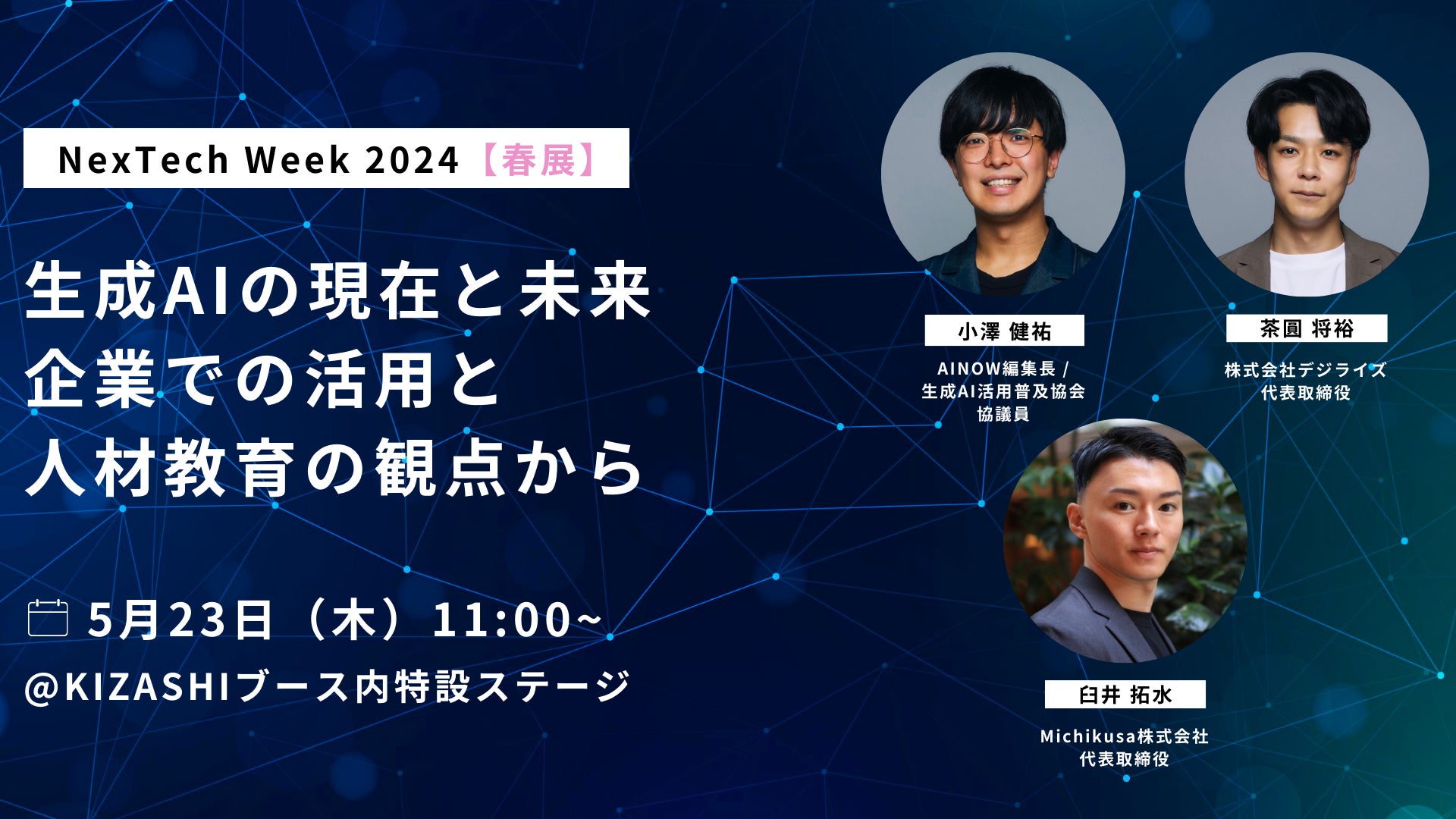 株式会社KIZASHI(所在地:東京都渋谷区、代表取締役:菅野 哲也、以下:KIZASHI)は、2024年5月22日(水)〜24日(金)に東京ビッグサイトで開催される人、企業、世界の「未来」を変革するソリューションとの出会いの場「NexTech Week 2024」にて、生成AI時代のリスキリングをテーマに、会場内で最大規模のブースを出展いたします。そのブース内の特設ステージにおいて実施するトークセッション・講演の登壇者第4弾をお知らせいたします。