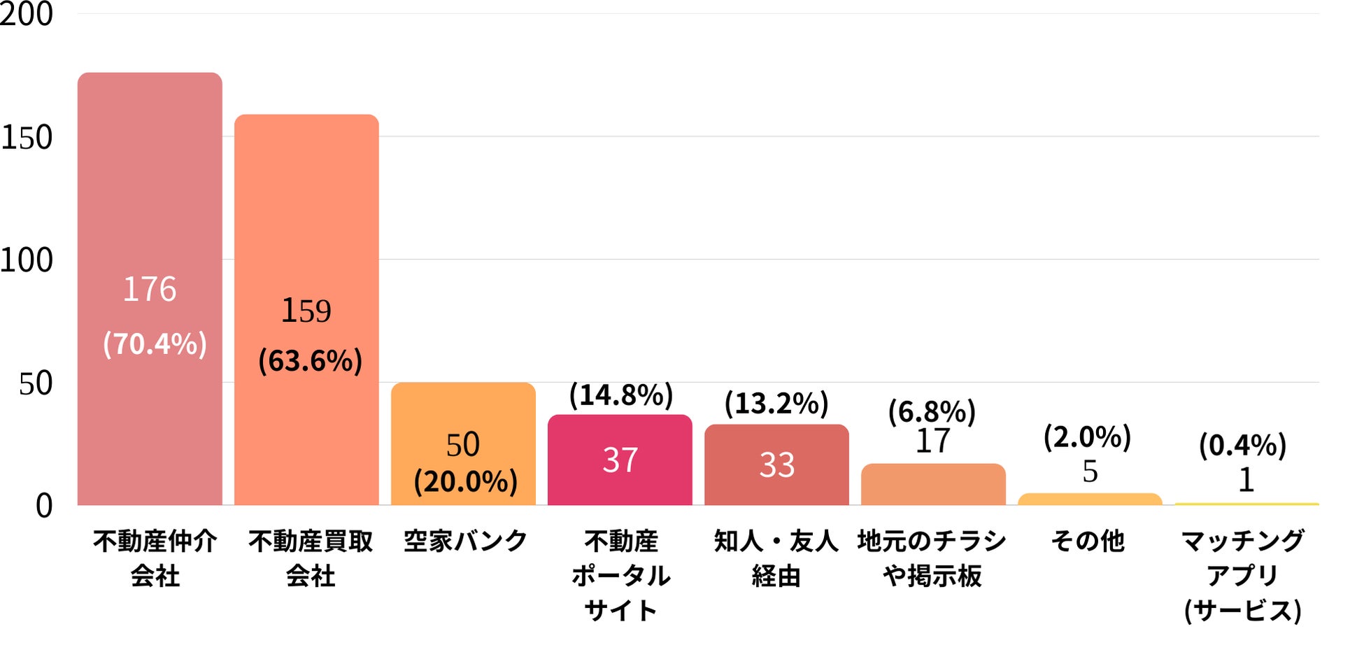 その結果、「不動産仲介会社(仲介)」を利用・検討する回答が70.4%と最も多く、「不動産買取会社」(63.6%)が続きました。また「空き家バンク」(20.0%)を検討する層も一定数存在し、従来の売却チャネルが根強い人気を保っていることがうかがえます。一方で、マッチングアプリ・サービス(0.4%)など、新興の手法はまだ十分に浸透していない状況です。
