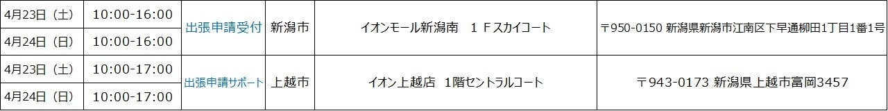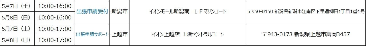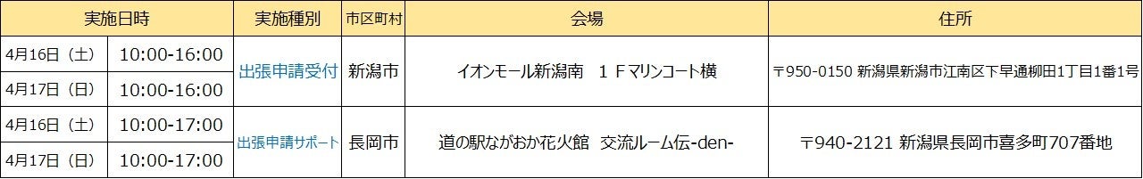 ※開催場所の調整状況や新型コロナウィルスの感染状況等により、「出張申請受付」及び「出張申請サポート」の開催を中止・延期、または実施内容が変更となる可能性がございます。