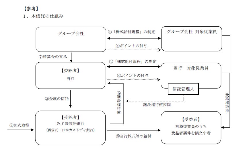 (1)当行グループの従業員を対象に、中期経営計画の連結当期純利益と個人の業績評価に応じてポイントを付与し、一定期間の継続勤務などの条件を満たした際に当該付与ポイントに相当する当行株式等を給付する仕組みです。