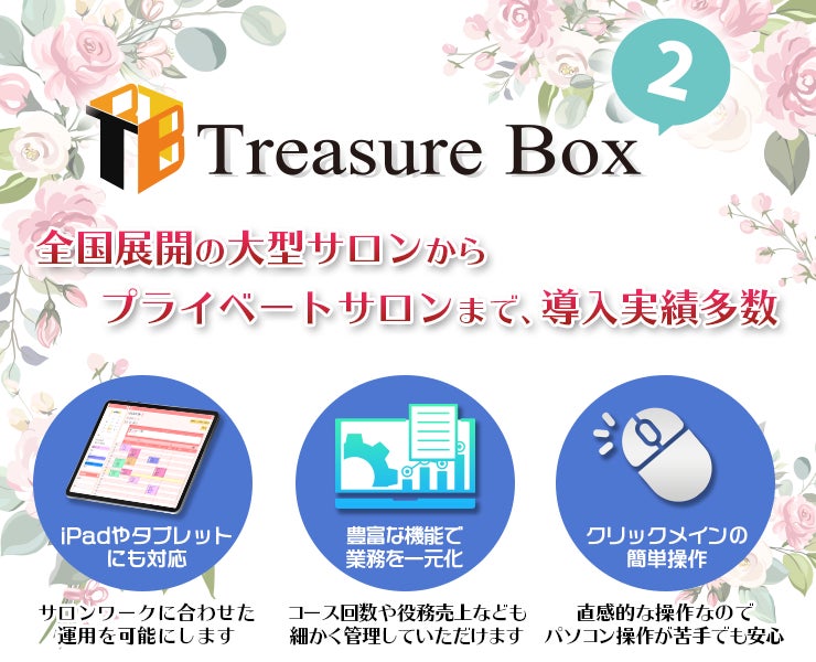 『TreasureBox2』は最先端のサロン向けクラウド顧客管理システムです。