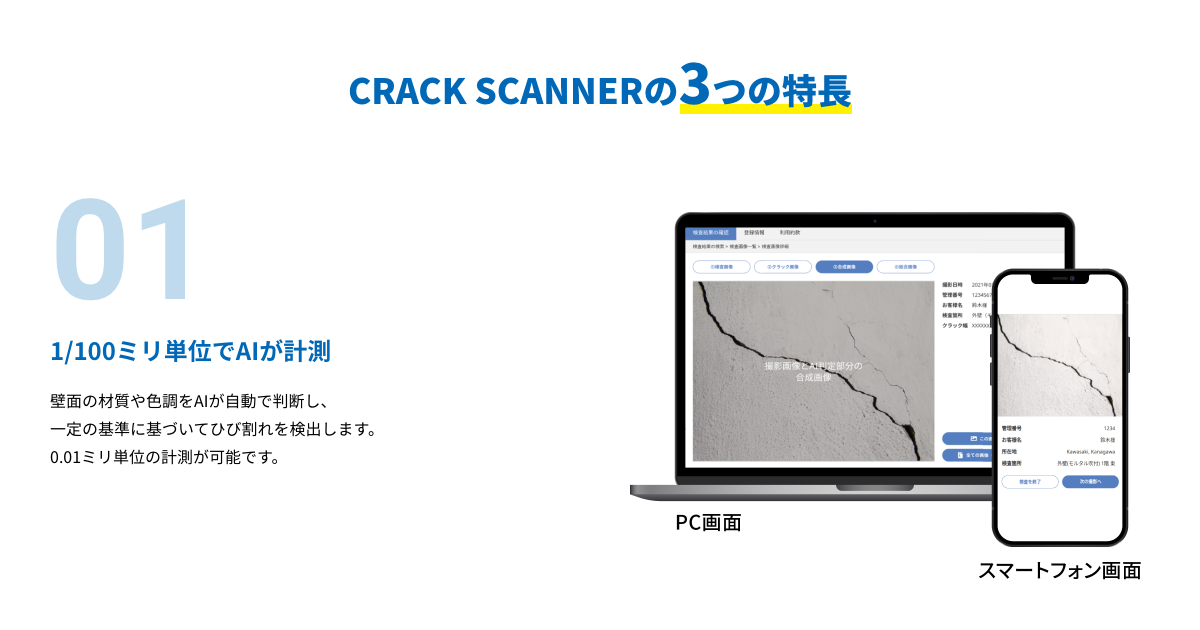 「CRACK SCANNER」はAIを活用した外壁クラック検査用アプリケーションです。スマホで撮影するだけでAIがひび割れを自動的に検出・計測し、最短15秒でスピード検査できる技術を搭載しています。