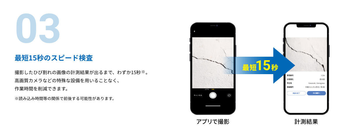 スマートフォン(※2)で撮影するだけで、AIがクラックを検出し、かつその幅を1/100ミリ単位で計測し、最短15秒でスピード検査できるアプリは、建設業における2024年問題に対処するための業務効率化や生産性向上に資するものであり、特に建設・住宅業界(戸建て)においては初めての取組み(※3)となります。
