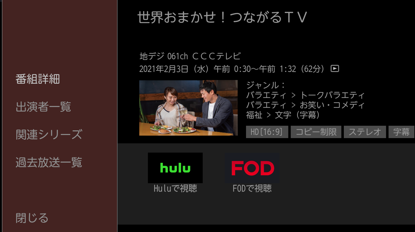 ヤマダホールディングスグループで独占販売する「FUNAIブランド」Android TV™搭載テレビの対象機種に搭載しております「新・つながる番組表」※2が、12月19日のソフトウェア更新により新たに動画配信サービス 「Hulu」と「FOD」に対応。「Hulu」と「FOD」の番組情報が番組表に表示できるようになりました。「新・つながる番組表」は配信番組情報を番組表上に表示でき、番組表から観たい番組を選択することで、それぞれのアプリを個別で起動することなく、配信番組を視聴できるサービスです。