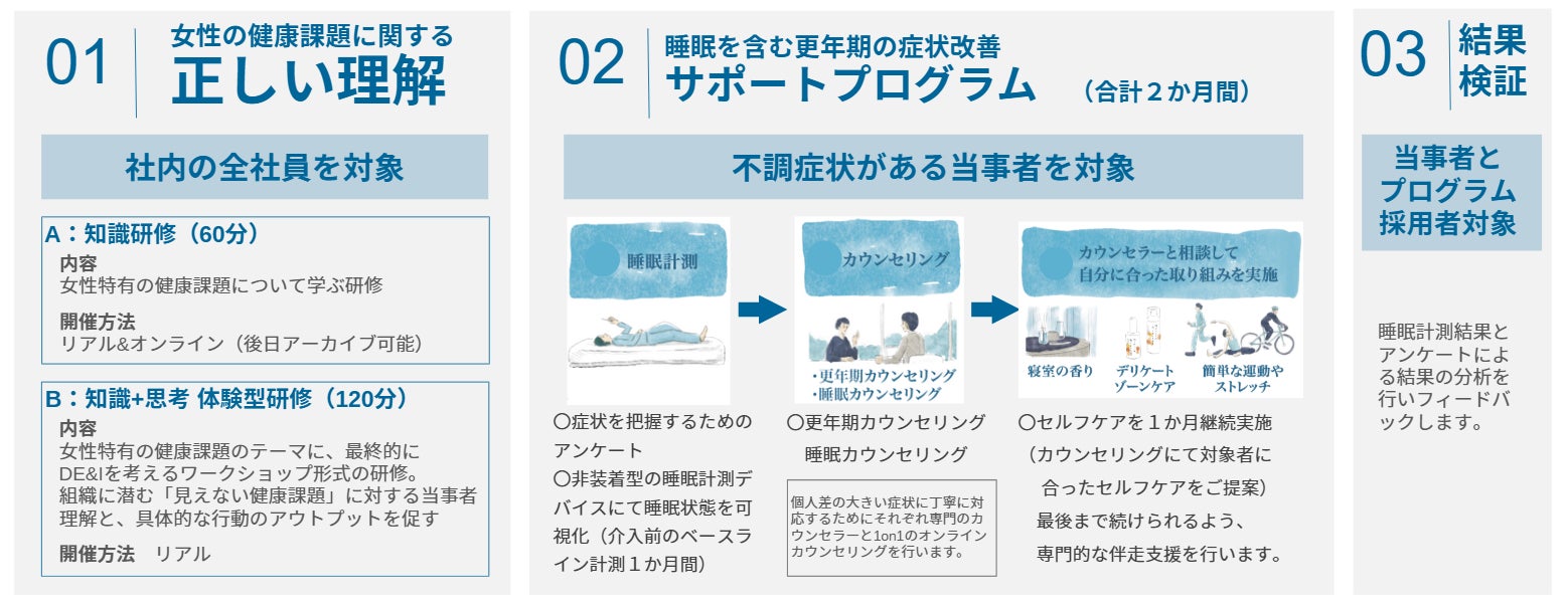 女性従業員の抱える更年期の症状や睡眠などの健康課題に対応するための包括的なサポートプログラムです。