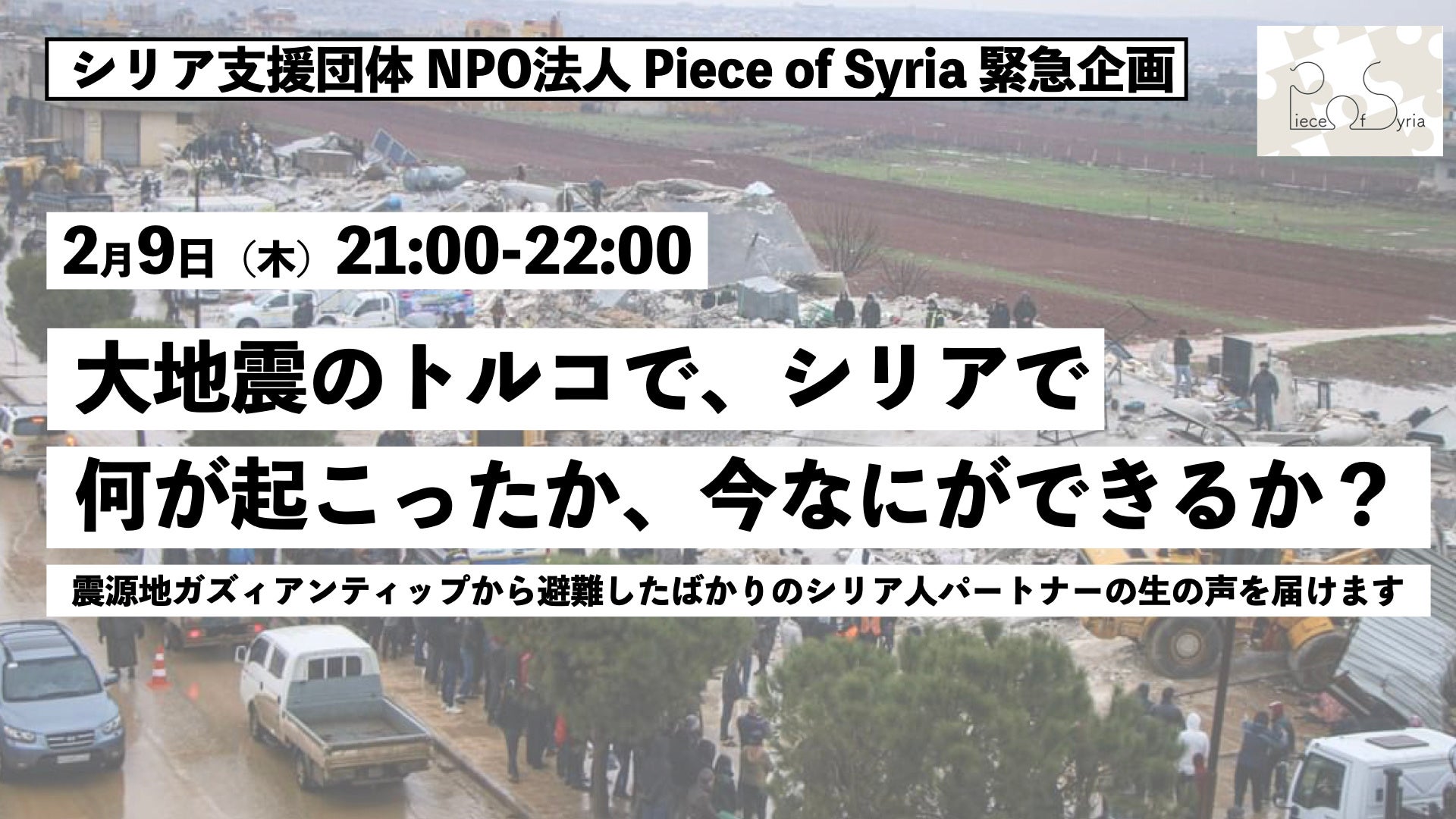 「【緊急開催・現地レポート】大地震のトルコで、シリアで、何が起こったか、今なにができるか?」を2/9(木)に開催いたします【NPO法人Piece of Syria】
