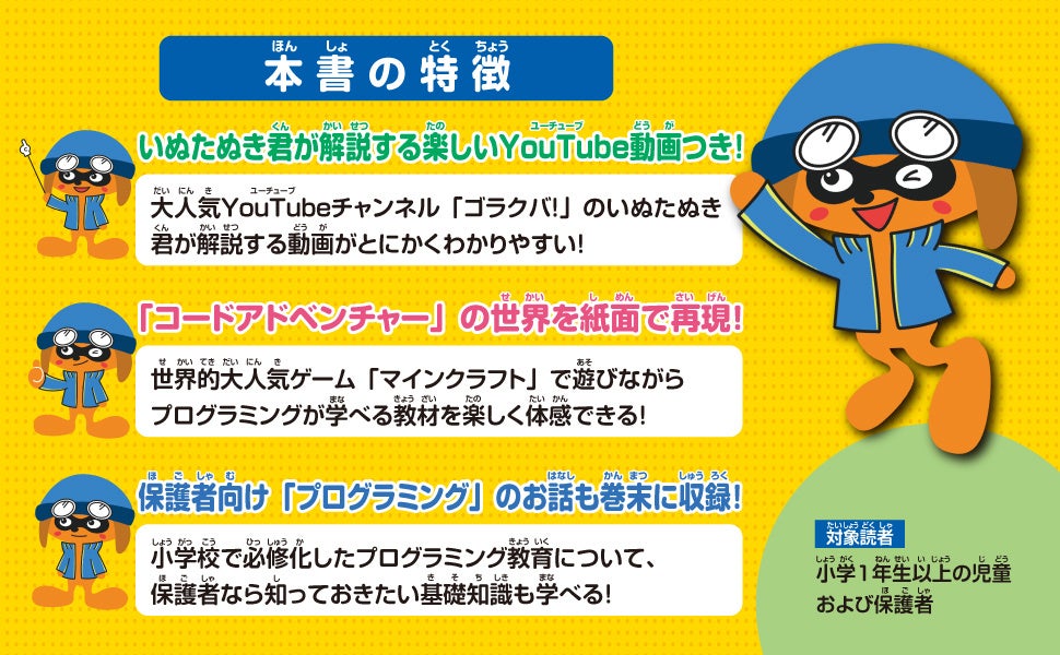 本書は、人気ゲーム「Minecraft(マインクラフト)」を活用しながら、プログラミングの基礎を子どもが直感的に理解できる構成となっています。