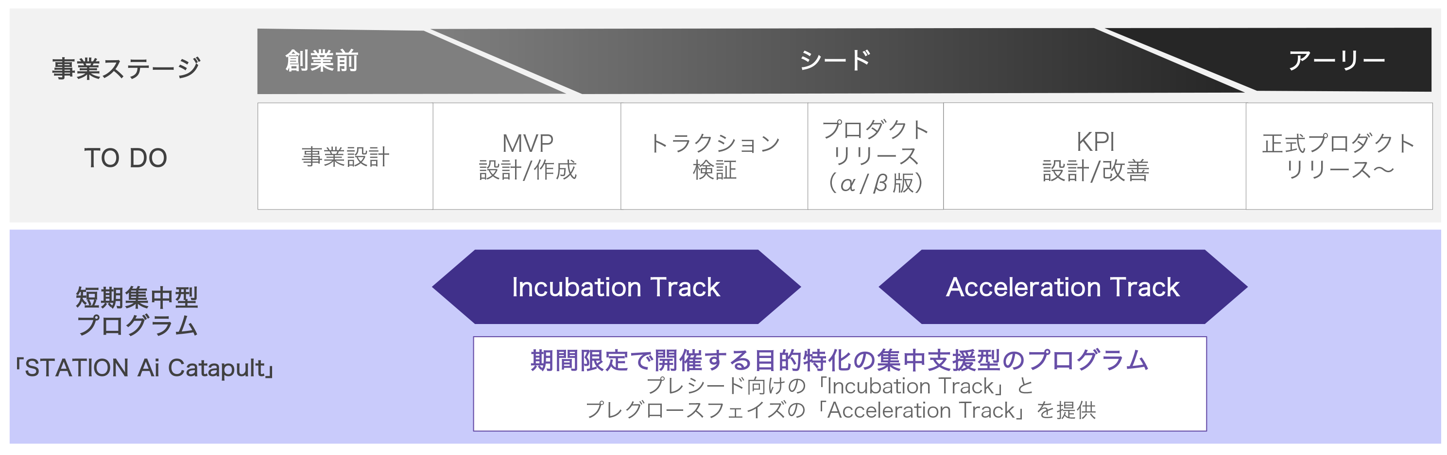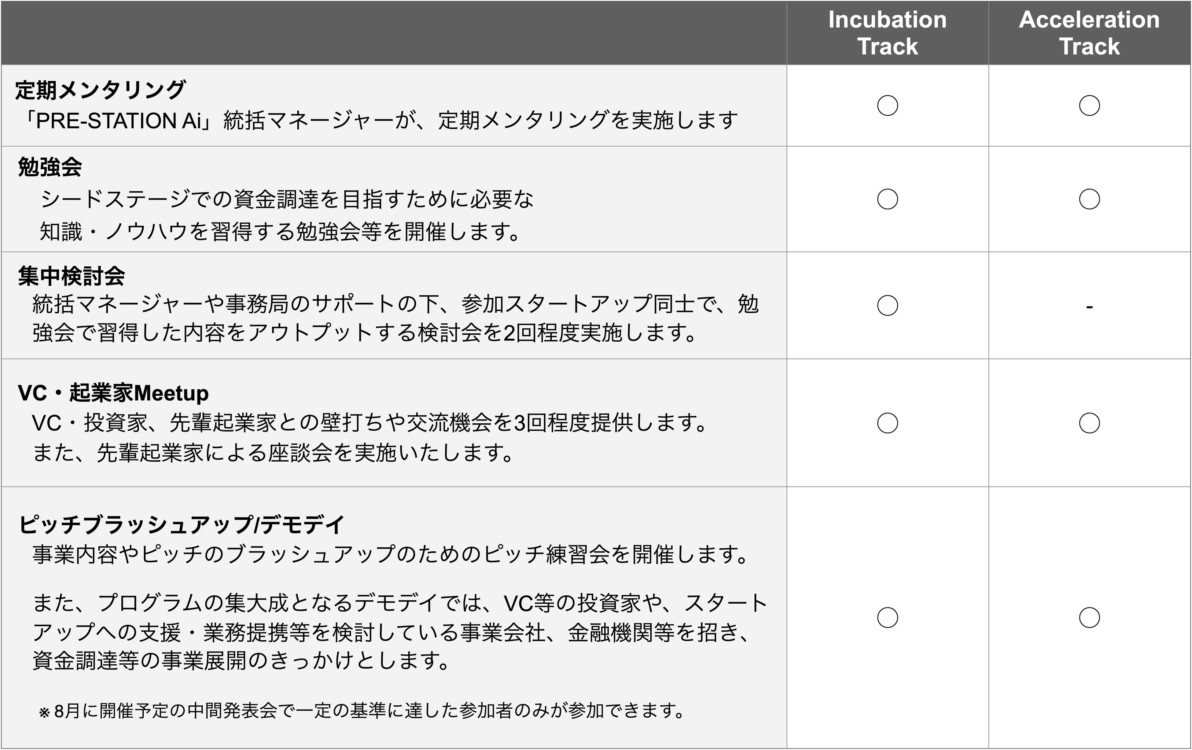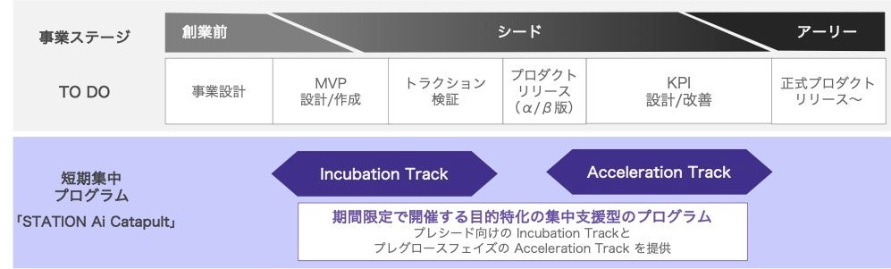 「PRE-STATION Ai」で展開する STATION Ai Catapult は、創業直後からシードステージまでのスタートアップを対象としており、4カ月間で資金調達が可能な状態を目指して事業成長を集中的に支援するプログラムです。スタートアップの成長ステージに合わせて「Incubation Track」と「Acceleration Track」を展開し、定期メンタリングや勉強会などを実施します。また、プログラム終了時に、成果発表の場としてDemo Day(デモデイ)を開催します。