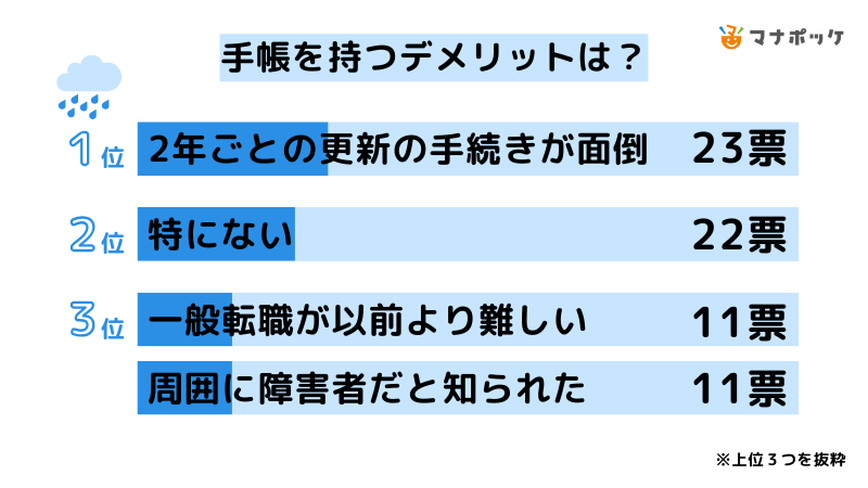 「2年ごとの更新の手続きが面倒」が手帳を持っているデメリット1位という結果に。続いて「特にない」と答えた方が22%、「一般転職が以前より難しくなった」「周囲に障害者だと知られた」が11%でした。