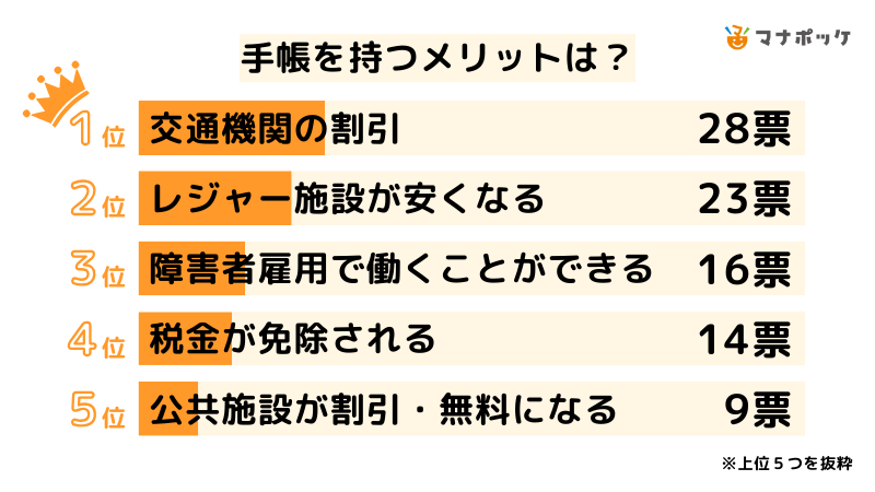 「交通機関の割引」が手帳を持っているメリット1位という結果に。続いて「レジャー施設が安くなる」が23%、「障害者雇用で働くことができる」が16%でした。
