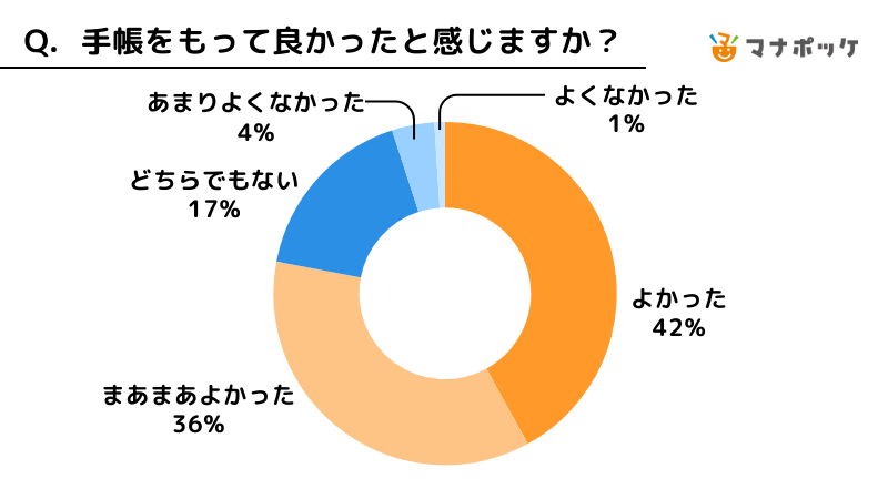42%の方が手帳を持っていて「よかった」と回答。36%の人は「まあまあよかった」と答えました。7割以上の方が、手帳を取得したことに対してポジティブな感情を持っているということがわかりました。