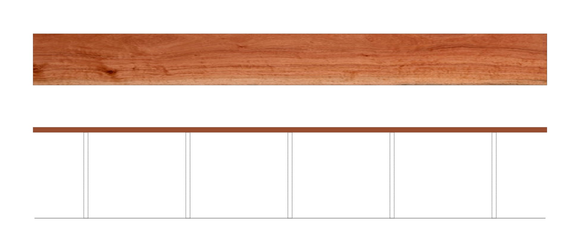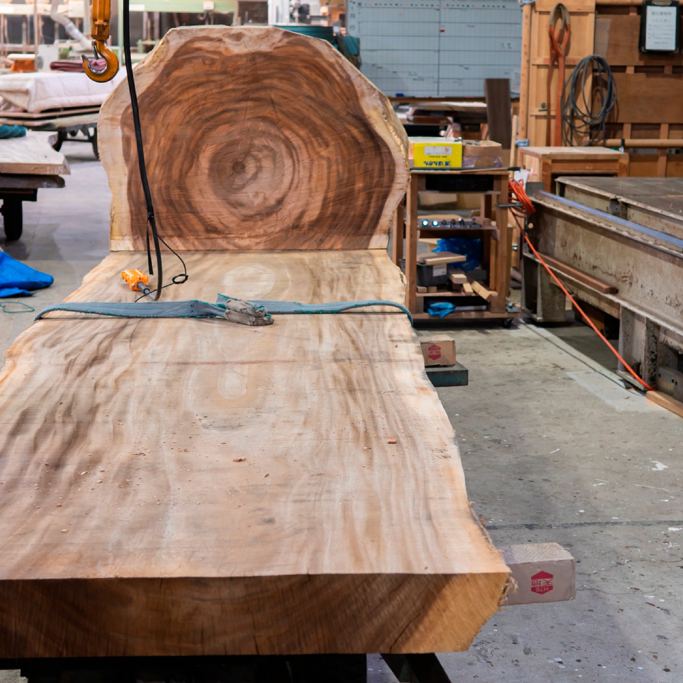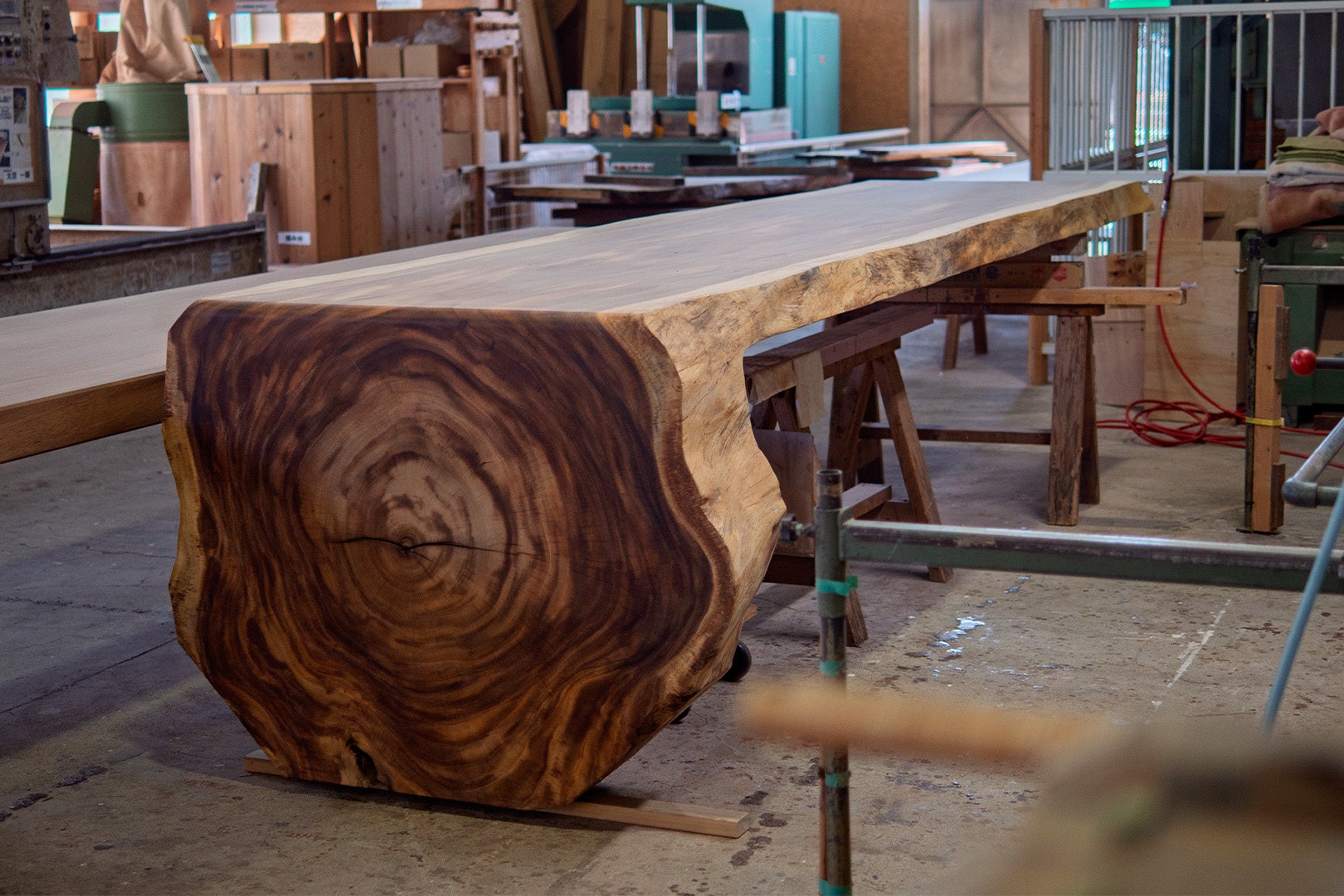 丸太そのものの美しさをありのままに表現できないか。脈々と受け継ぎ発展させてきた技術力と探求心を以て試行錯誤を重ね辿り着いた境地。無垢材の可能性を追求し「究極の一点モノ」として送り出す。