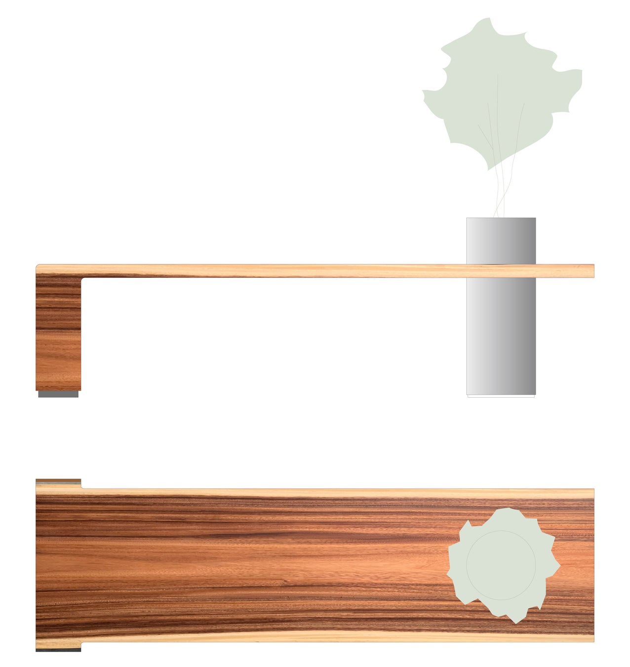 太平洋を渡り日本へやってきた、直径1.2メートルを超える巨大な丸太。その丸太から削り出し、ダイナミックに仕上げたLOG-ingは、自然の恵みがそのまま文明社会に運び込まれたような印象を与える。商業スペースや住空間における「人と自然」、新しい調和の形の提案だ。
