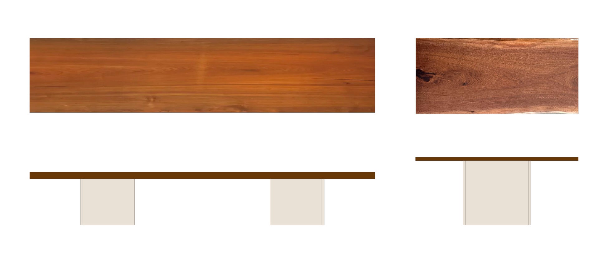 世界三大銘木:チークに酷似したイロコの重厚感ある一枚板テーブルとブラックウォールナットのハイテーブルのセット。
