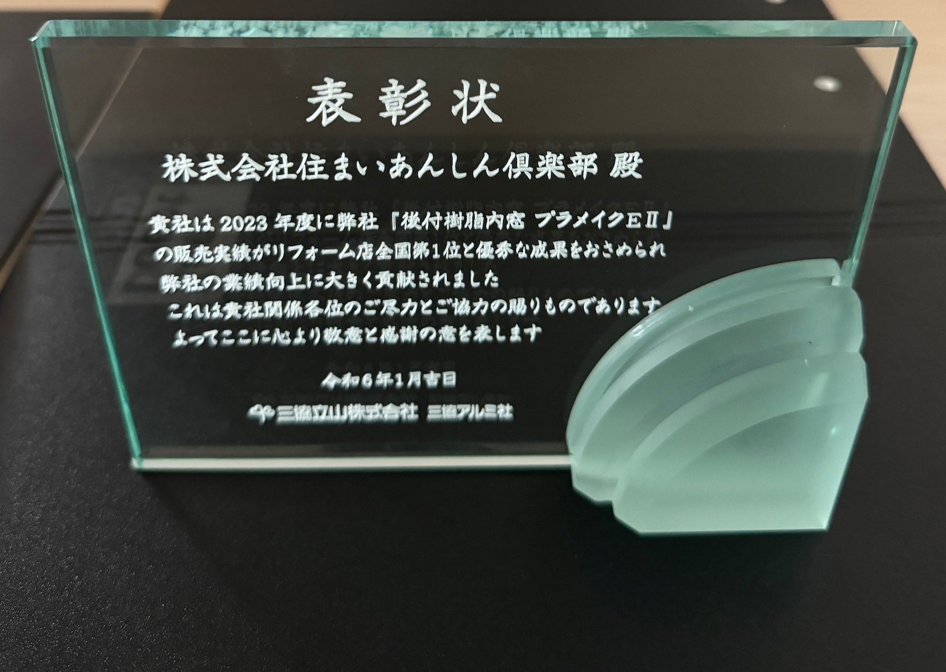 2023年度には省エネ断熱リフォームの代名詞でもある内窓工事で、三協アルミ社のプラメイクという内窓で全国一位、LIXIL社のインプラスという商品では全国3位の成績を収めております。