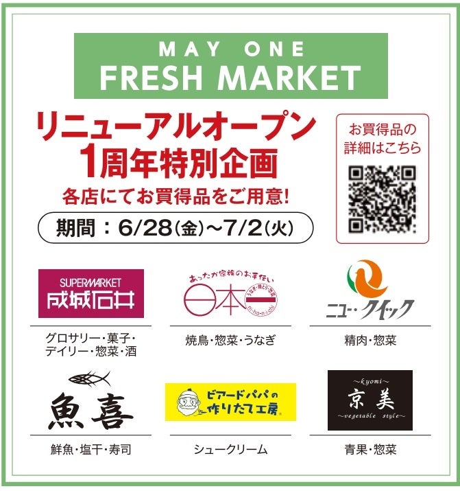 メイワン地下食品「FRESH MARKET(フレッシュマーケット)」がリニューアルオープン1周年を記念して、右記店舗にてお買得品をご用意しております!