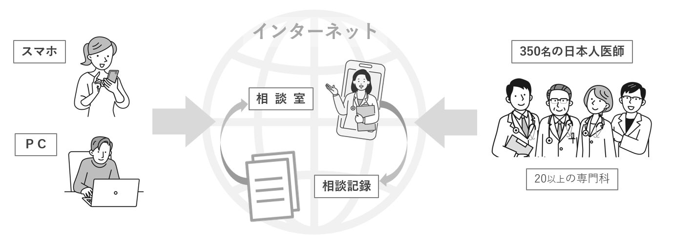 ・350名以上の日本人医師(国内約130名・海外約220名)が、各々のタイムゾーンで対応する仕組みを構築し、サービス利用者は24時間いつでも気軽に相談することが可能。