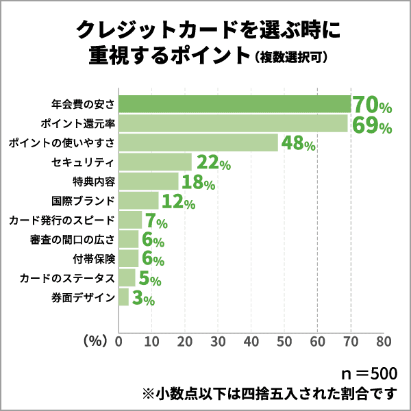 クレジットカードを選ぶ時に重視するポイントとして最も回答数が多かったのは「年会費の安さ」、続いて「ポイント還元率」でした。