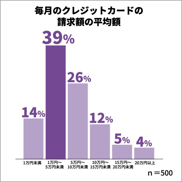 500人の方を対象にクレジットカードの毎月の請求額の平均額を調査したところ、1万円~5万円未満が39%と最も多く、続いて5万円~10万円未満という結果になりました。
