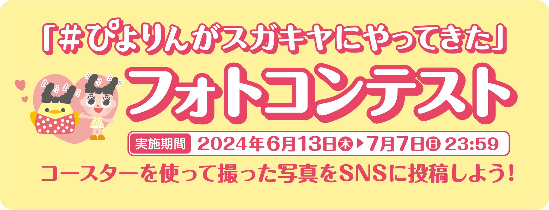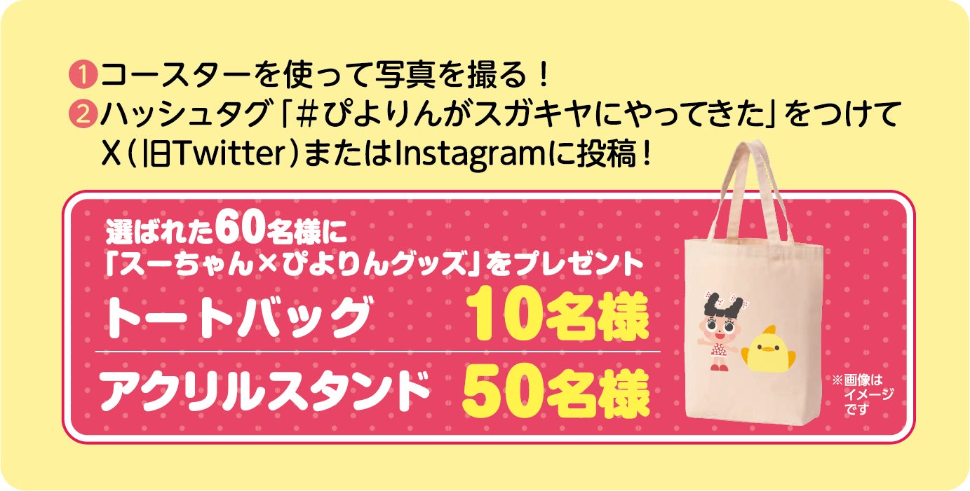 スガキヤ×ぴよりん スーぴよちゃんプリンパフェとオリジナルコースターを使って撮った、かわいい写真を「#ぴよりんがスガキヤにやってきた」のハッシュタグをつけて投稿してください。ここでしか手に入らないスーちゃん、ぴよりんのコラボグッズを手にいれるチャンスです。