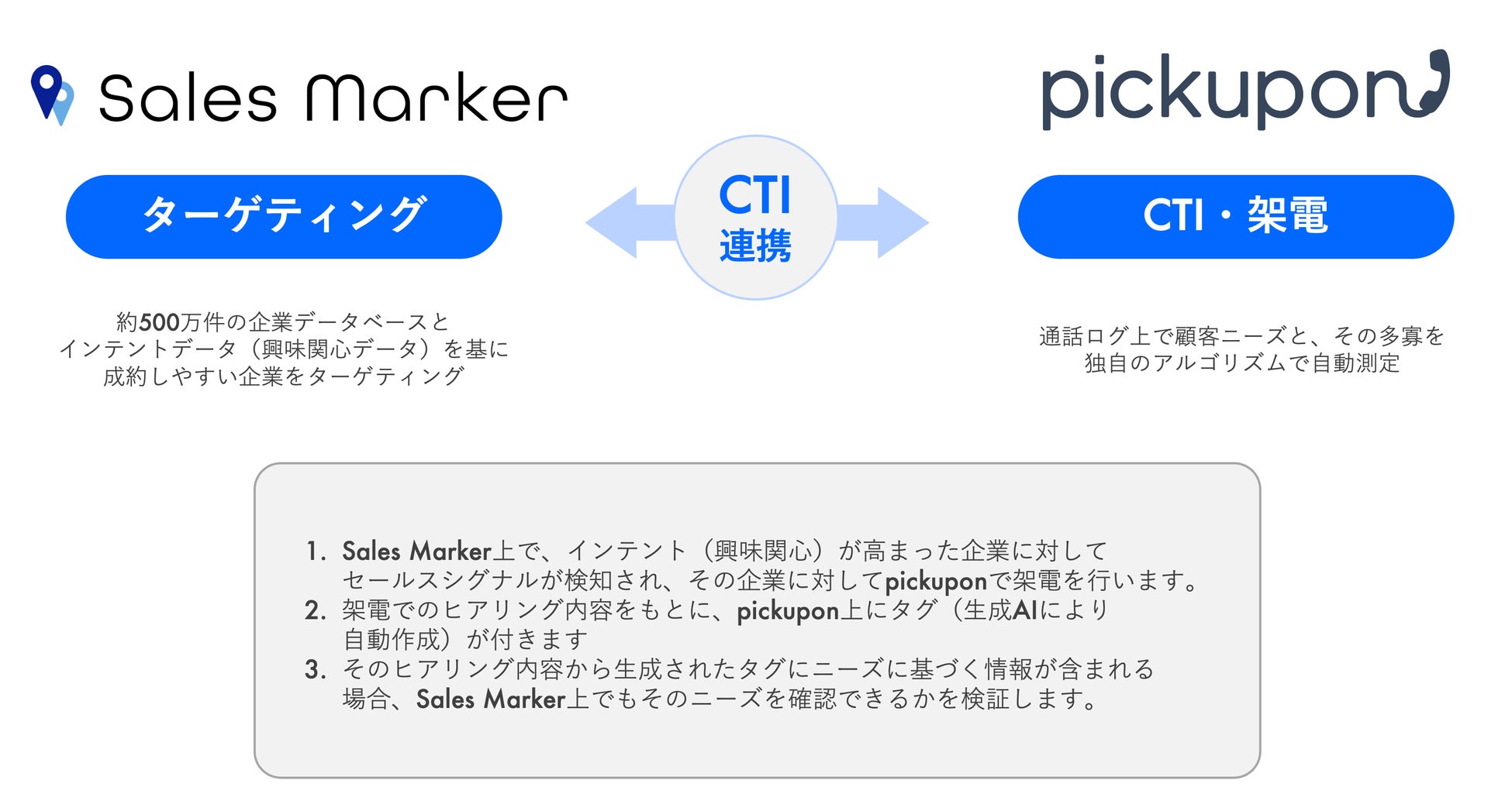 この共同PoCは、顧客の声を自動的にピックアップするpickuponと顧客のインテントデータ(興味関心データ)を活用したSales MarkerのCTI連携によって行います。