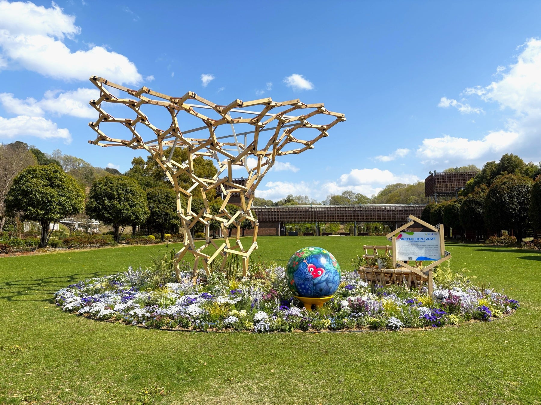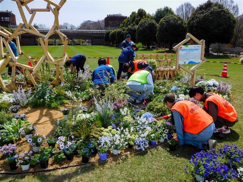 今回のPR出展では、大地から湧き出す樹木のようなモニュメントと、元気な春の芽吹きの草花で、多様な出会いの喜びを演出し、植物や生き物が時とともに移り変わる姿で「自然と社会の調和」を表現しています。 モニュメントは、2024年秋開催の全国都市緑化かわさきフェアに展示したものを今回移築し、環境に配慮した、サステナブルな展示となっています。