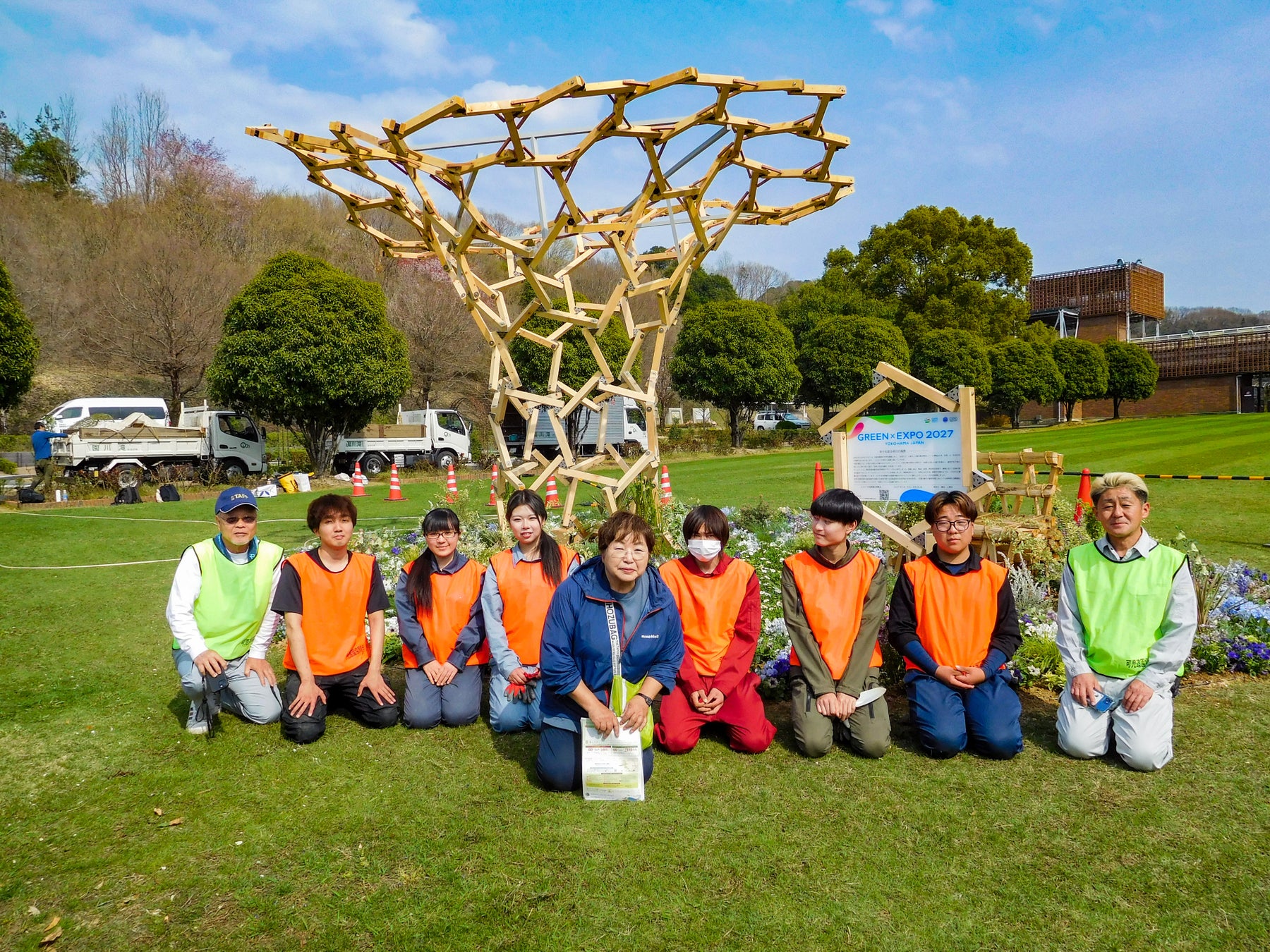 また、モニュメントに用いる木材は、持続可能な森林経営を実践する神奈川県立吉田島高等学校と連携し同校の演習林の木材を活用しております。モニュメントの足元に広がる花壇の植付や維持管理にあたっては、岐阜県立国際園芸アカデミーにご協力いただきました。多くの方々による共創でPR出展を行っております。