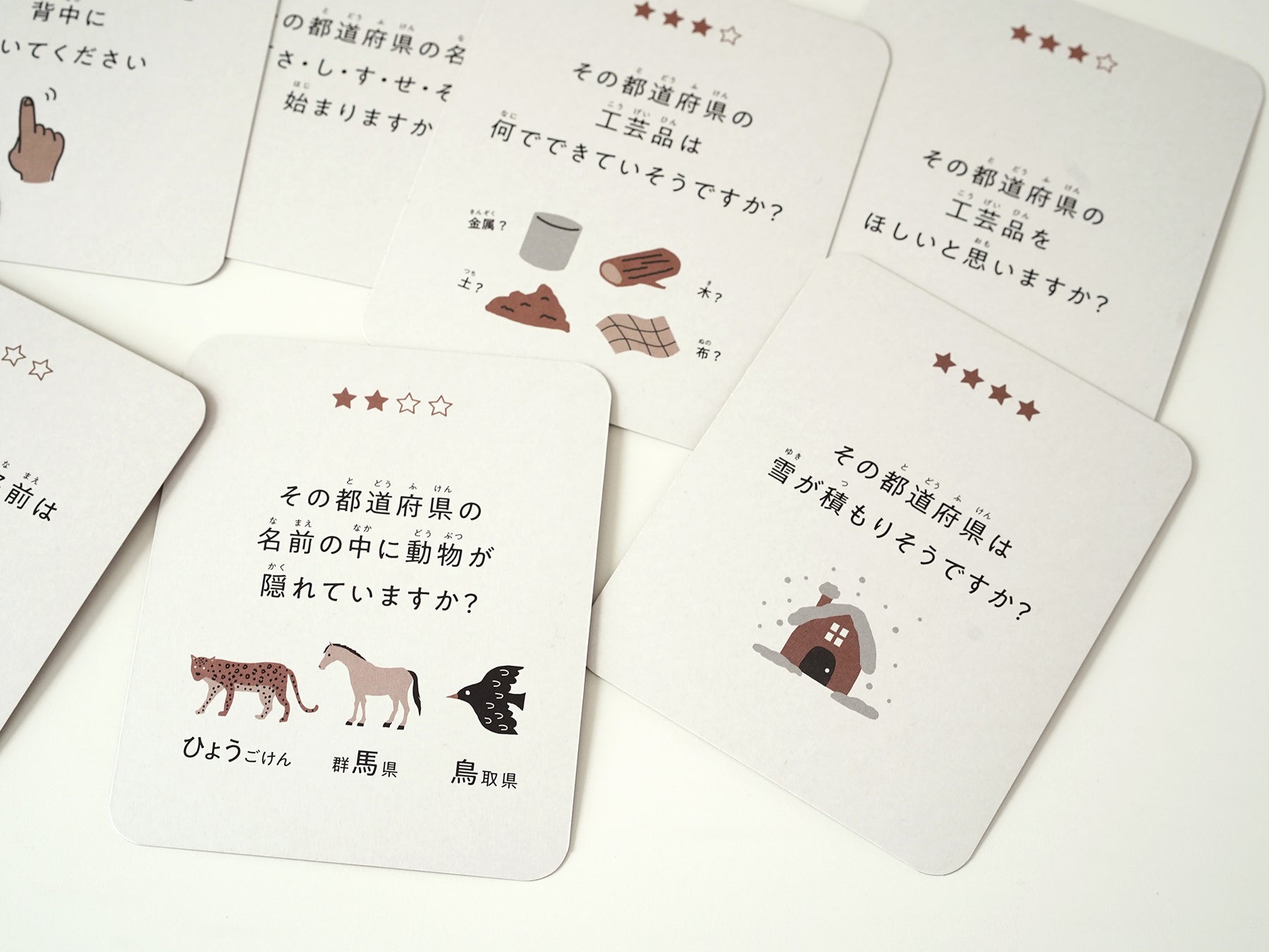 「質問カード」50枚と「都道府県カード」47枚、日本地図入り説明書が付いています。