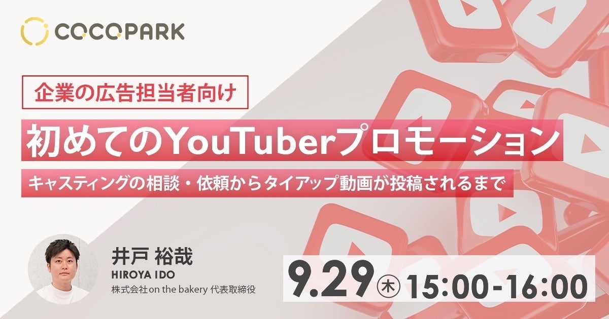 SNS運用・インフルエンサーPRのためのプラットフォーム「COCO PARK」を運営する株式会社on the bakery(本社:東京都港区 代表取締役:井戸 裕哉)は、2022年9月29日 (木)15:00より、『【企業の広告担当者向け】初めてのYouTuberプロモーション〜キャスティングの相談・依頼からタイアップ動画が投稿されるまで〜』をオンラインにて開催いたします。